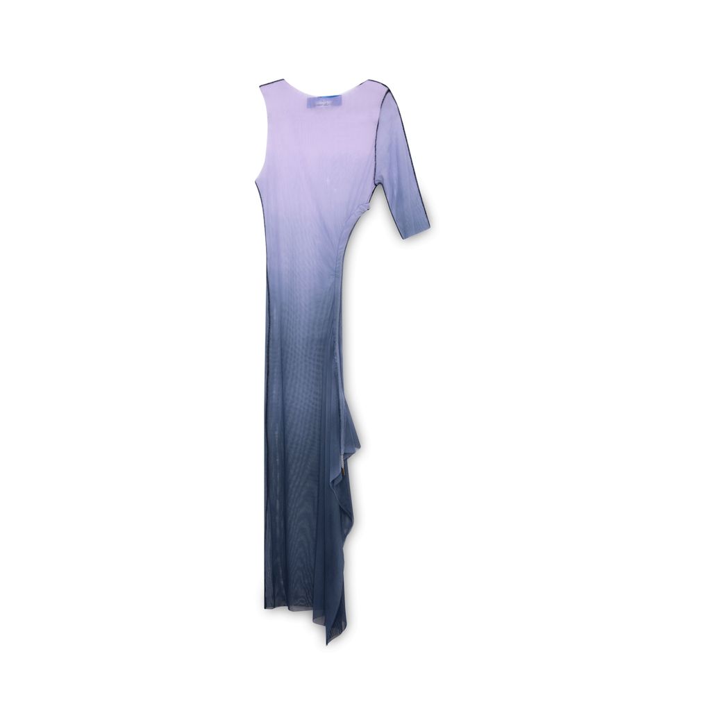 4 way stretch mesh with asymmetrical sleeves and adjustable cord detail on side. Hand dyed and hand sewn by Hanan Sharifa Because each dress is uniquely dyed, no two items are alike.