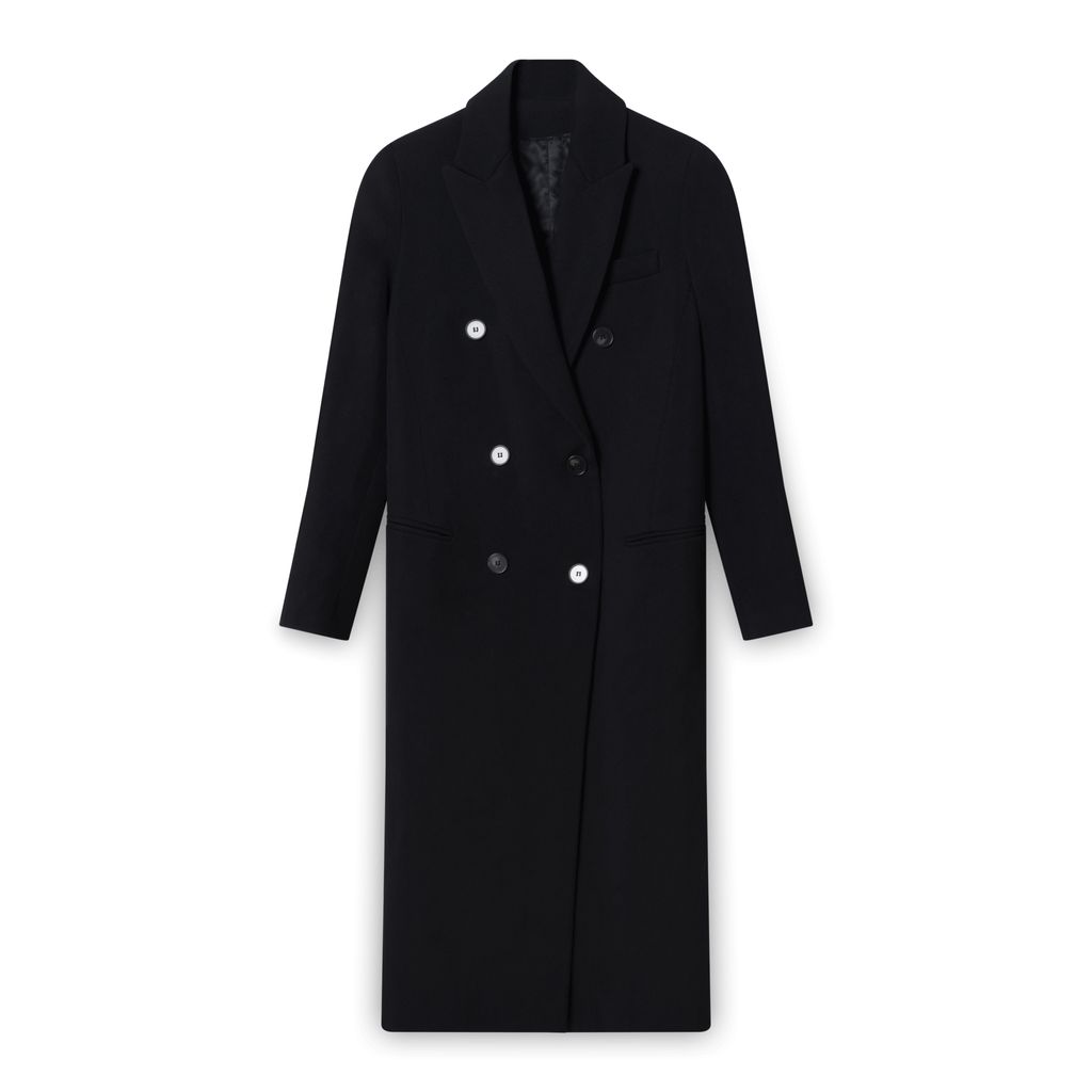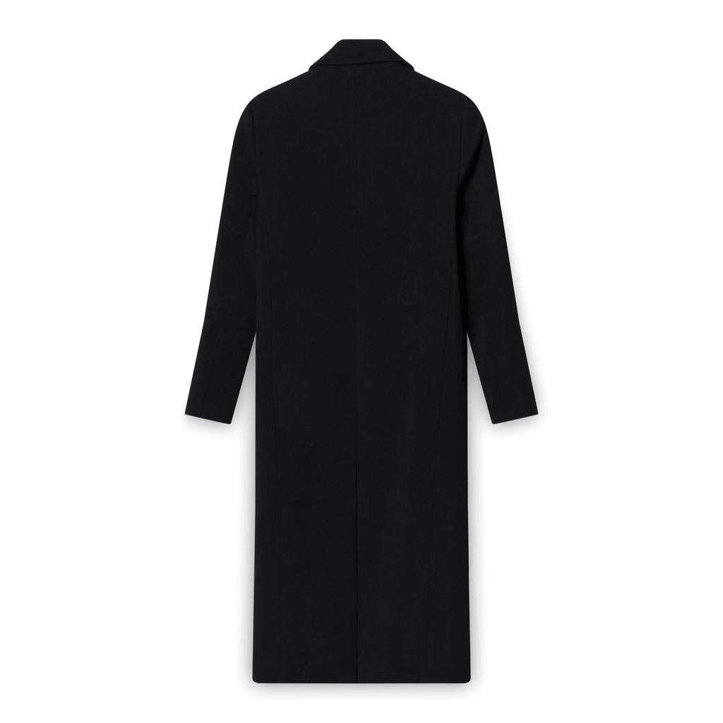 This black trench features ribbed fabric, decorative and functional buttoning, and two front pockets at the waist.