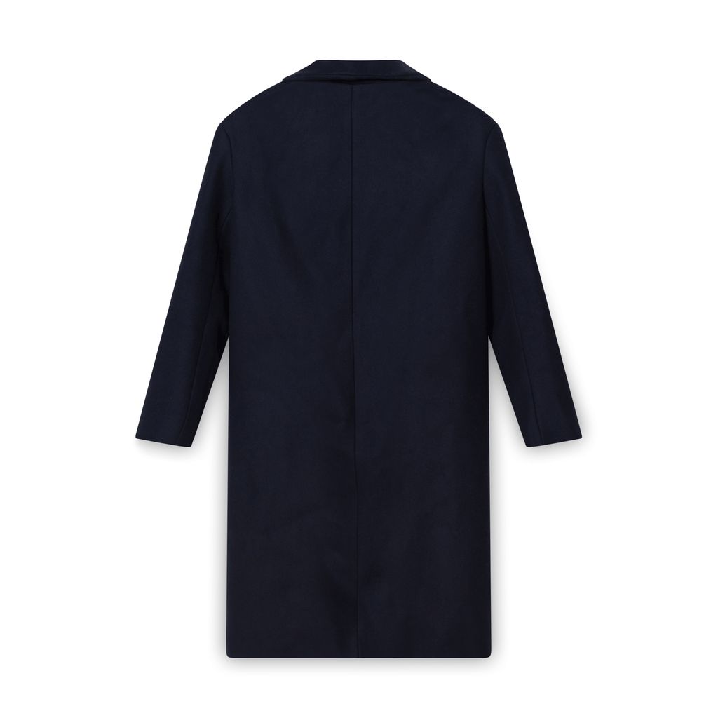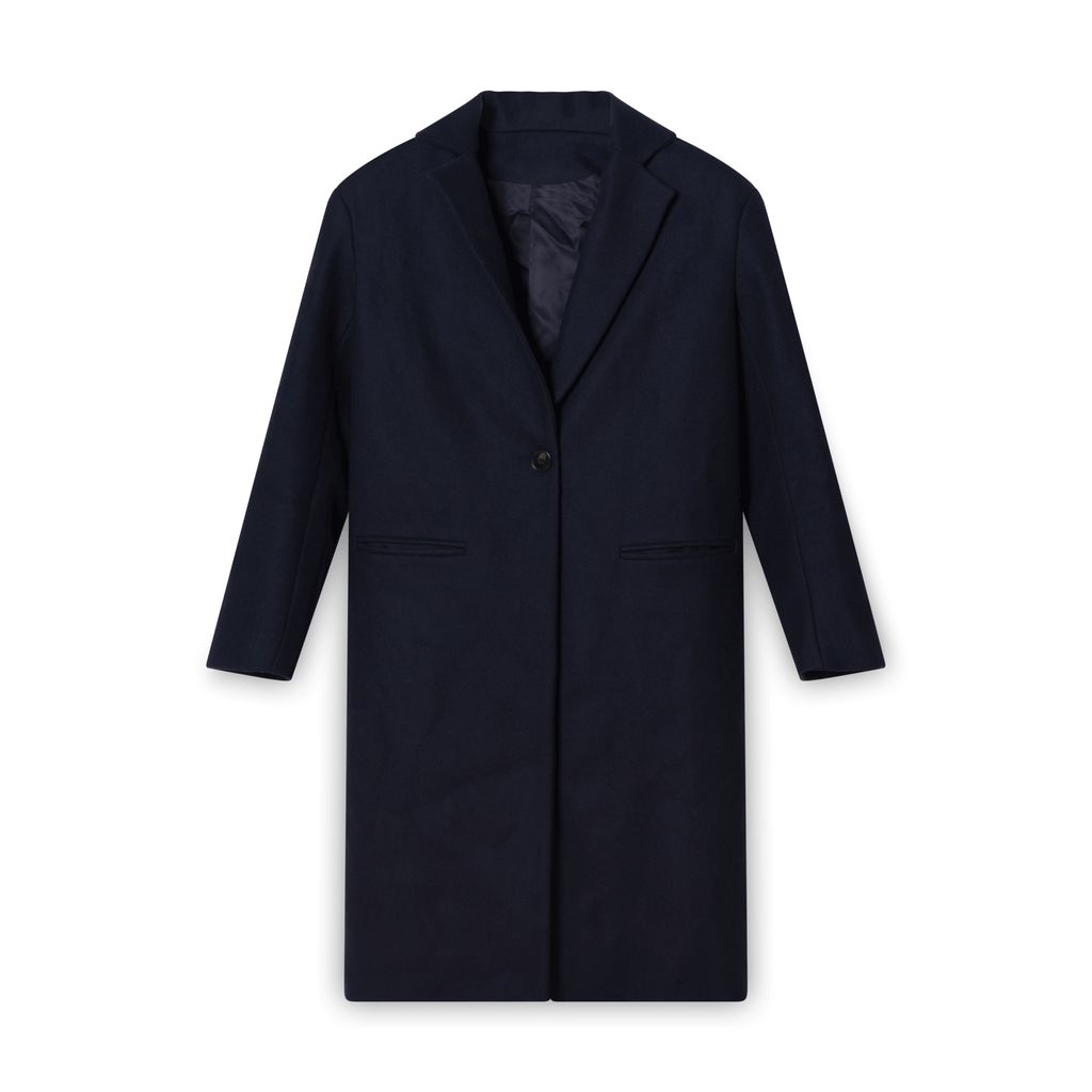 Harmony Trench in Navy features wool and cashmere blend.
