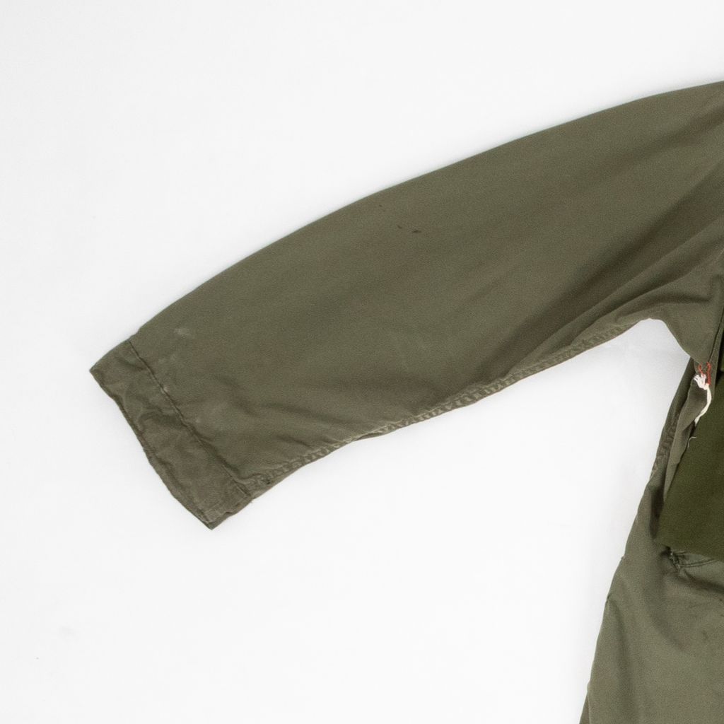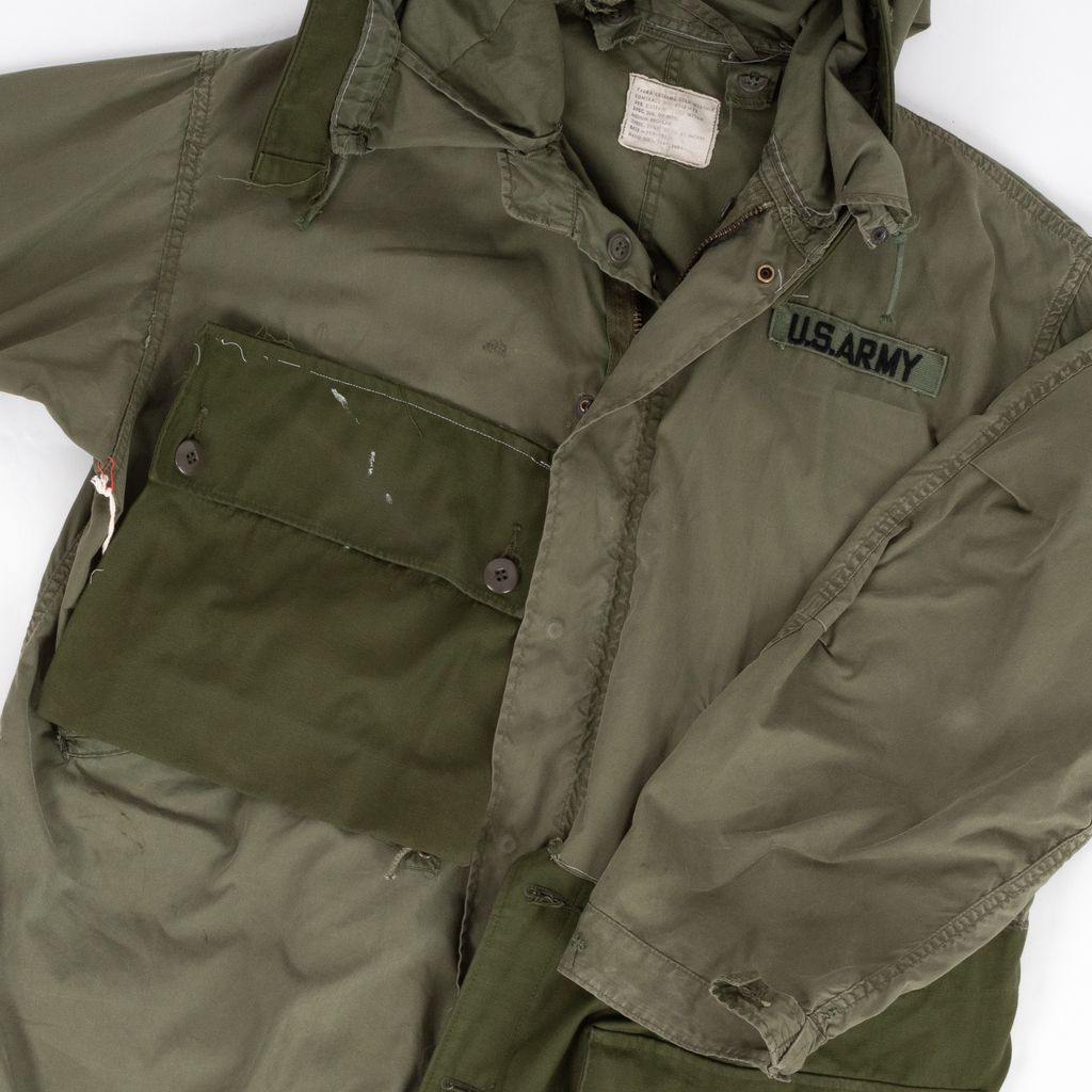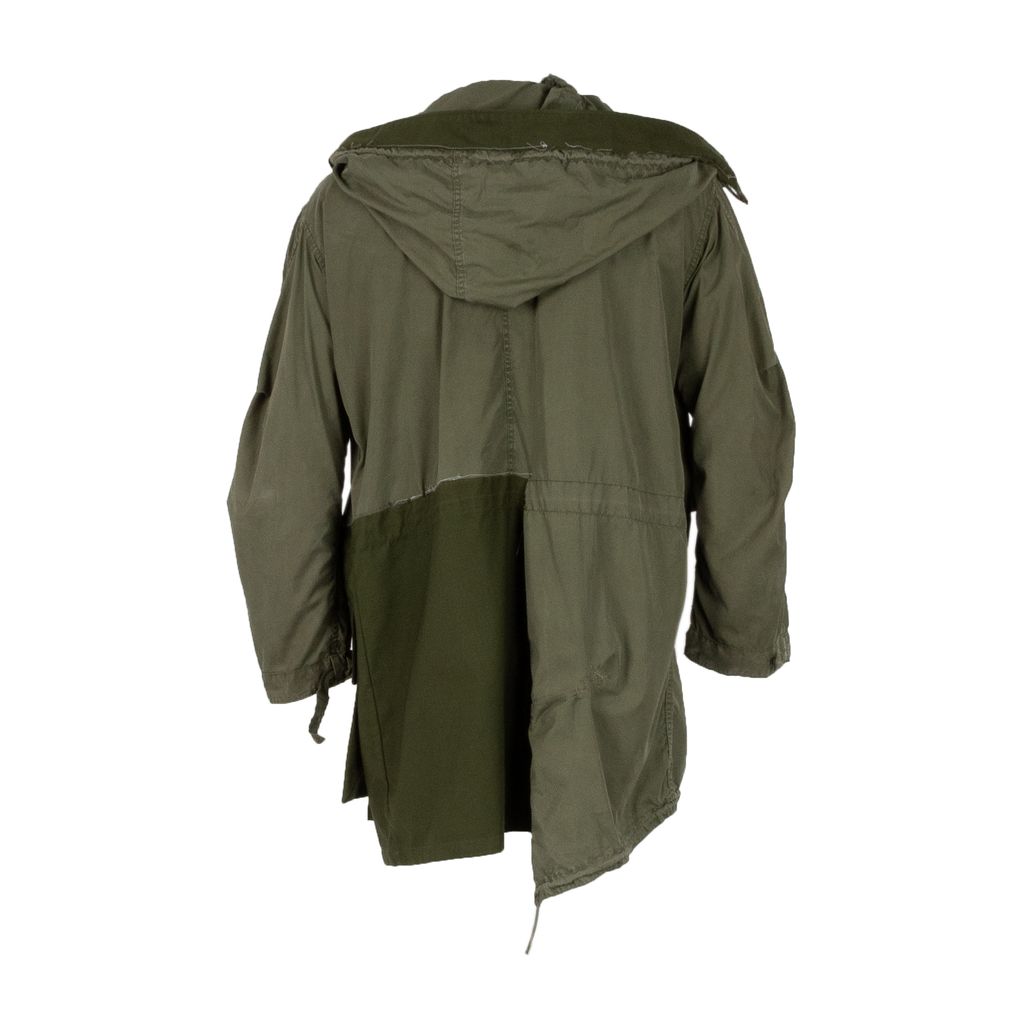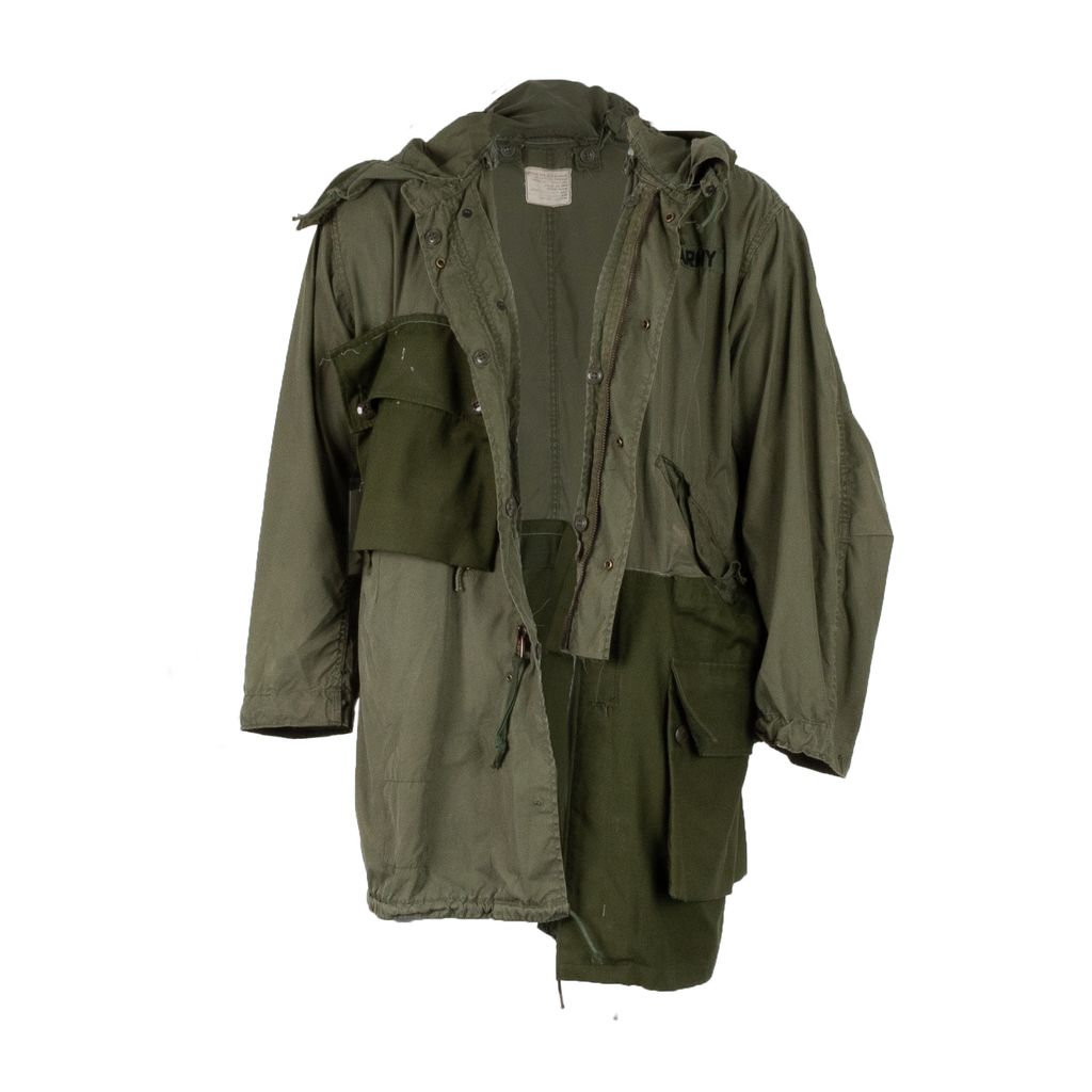 A one of a kind jacket designed by Hathenbruck, this lightweight parka made from vintage military fabric is a total statement piece. Features pieced together body, zip and snap closure at front, set of pockets on front with one at chest and the other near bottom on opposite side, asymmetrical shape, full hood, and US Army patch on left side of chest.
