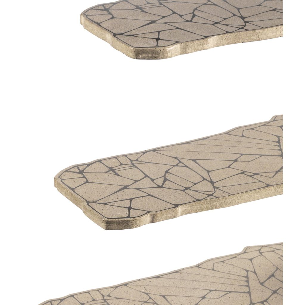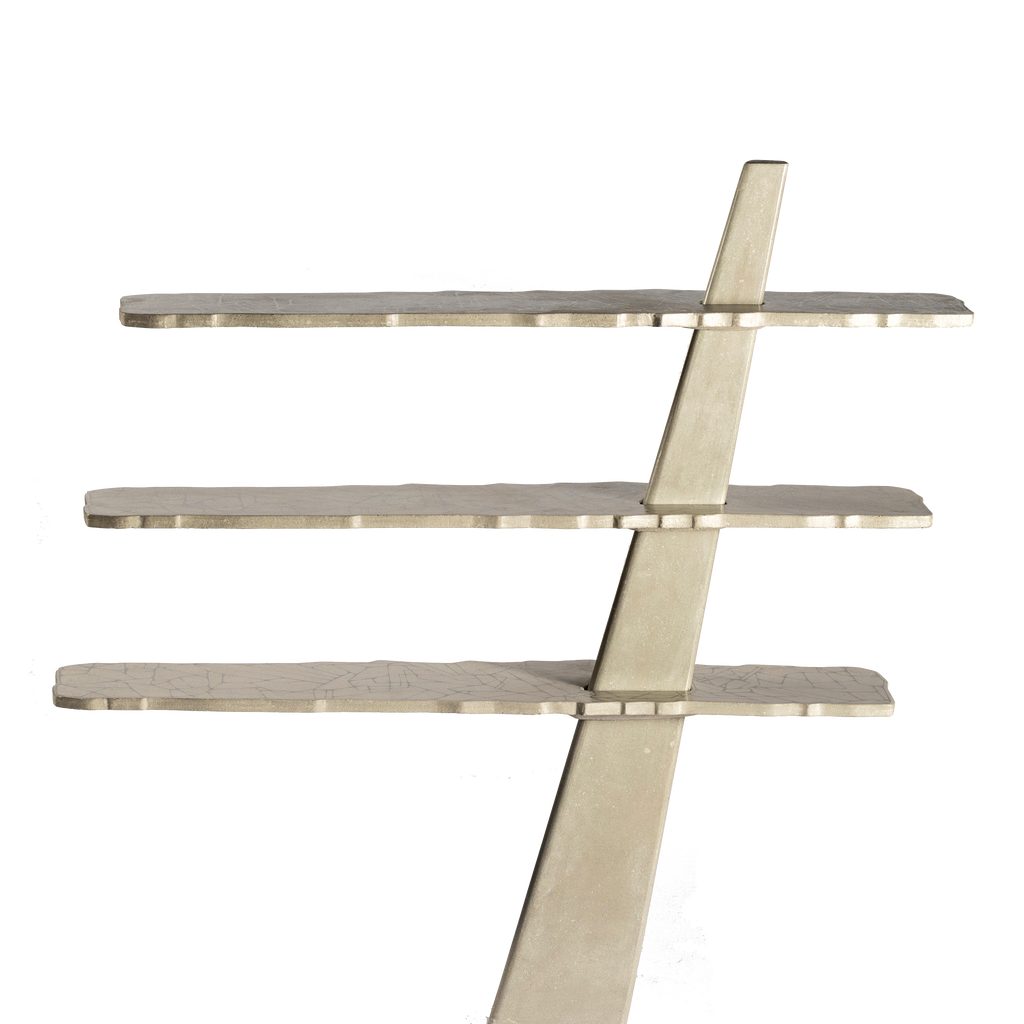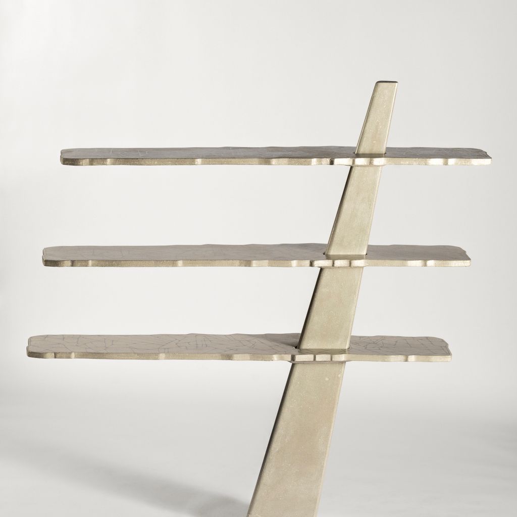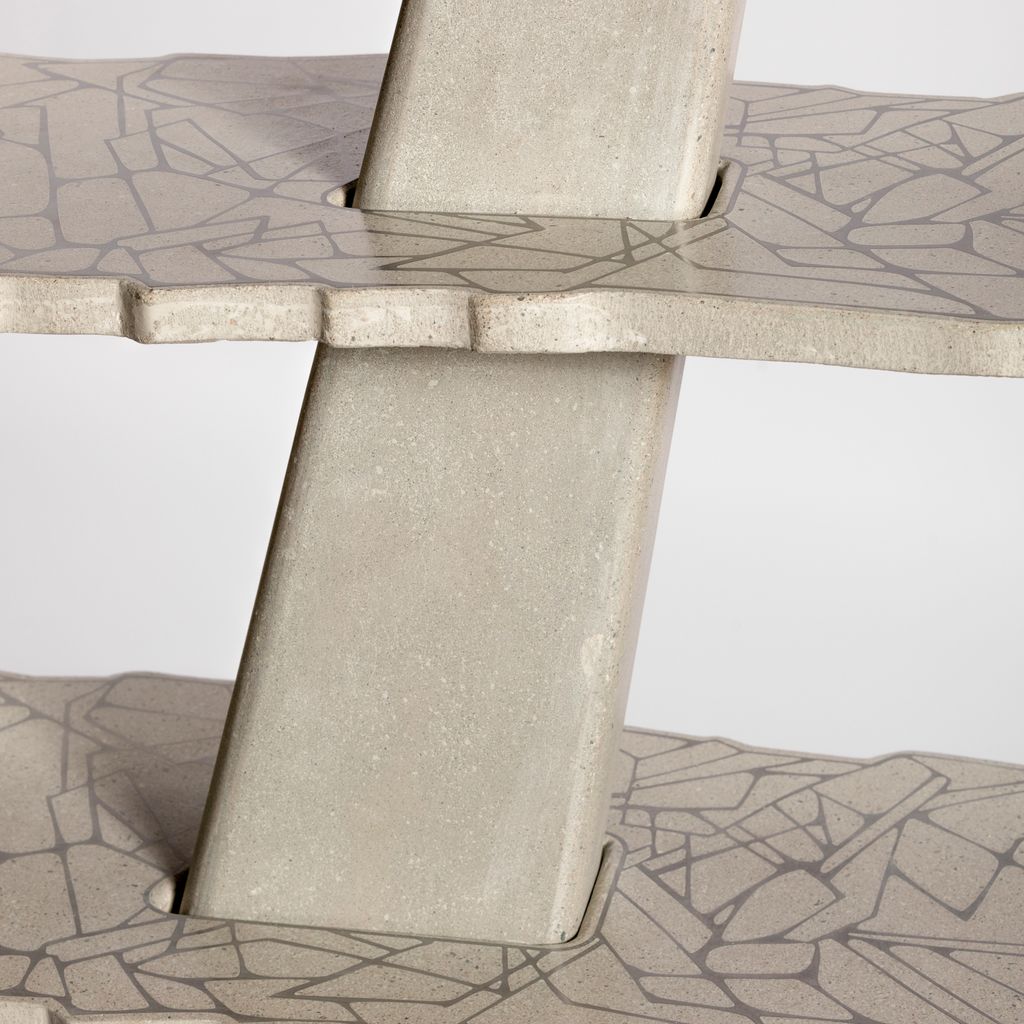 The Exo Triple Locking Shelf stands proudly at 68" tall and features three gravity locking shelves, in an organically stunning Exo motif. Impossibly balanced and an engineering marvel. The Stainless Steel Exo structure incorporated into James de Wulf's signature concrete creates strong, thin surfaces to withstand outdoor conditions and the test of time. Suitable for indoor and outdoor display. Property installation requires an anchor bolt in the floor.
