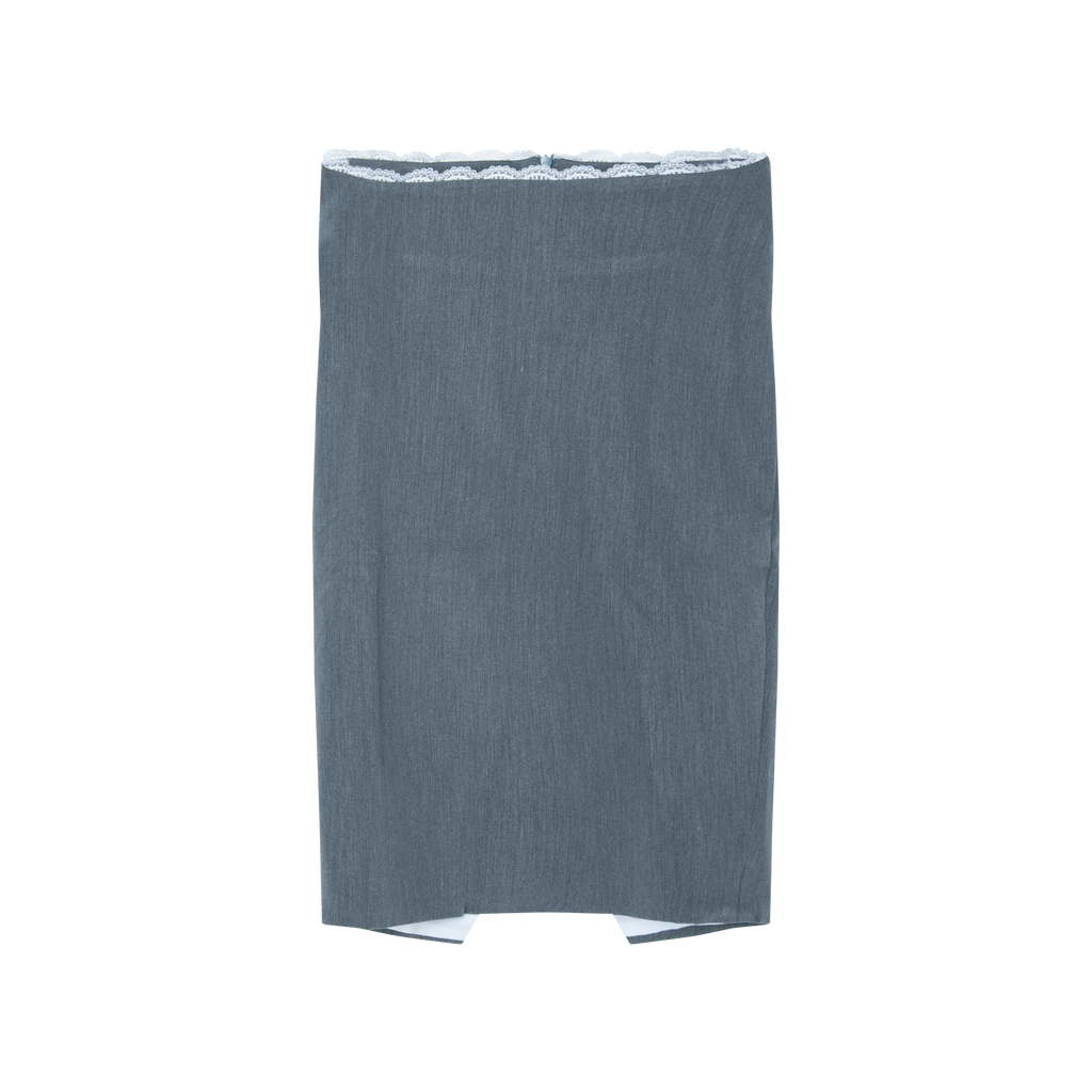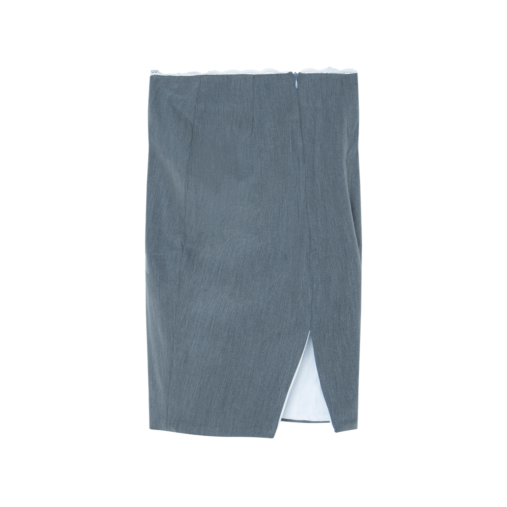 Hayle Midi Skirt features knee length, lace trim detailing, low waist, and fitted style.