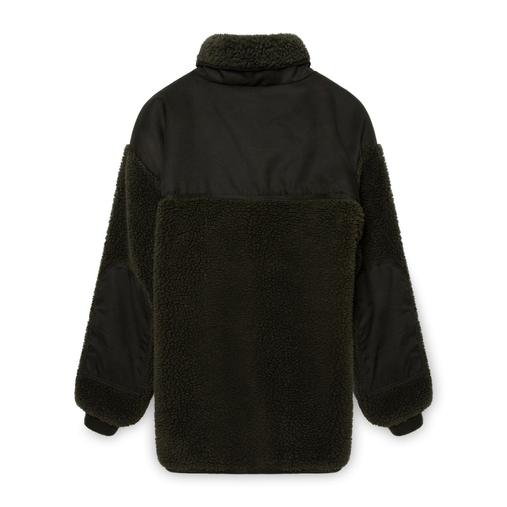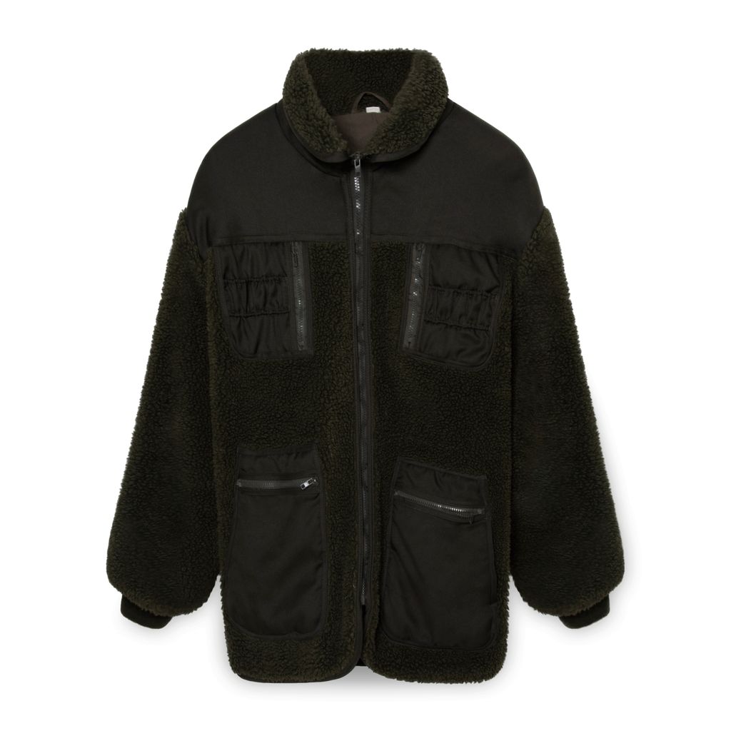 Shearling jacket features thick material, olive green coloring, four large pockets, and a front zipper.