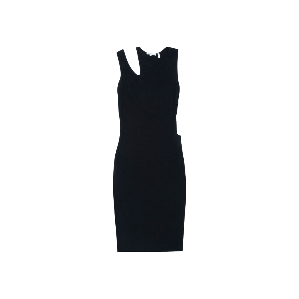 Helmut Lang Black Cutout Dress features rib knit, cutout at shoulder and side, and midi length.