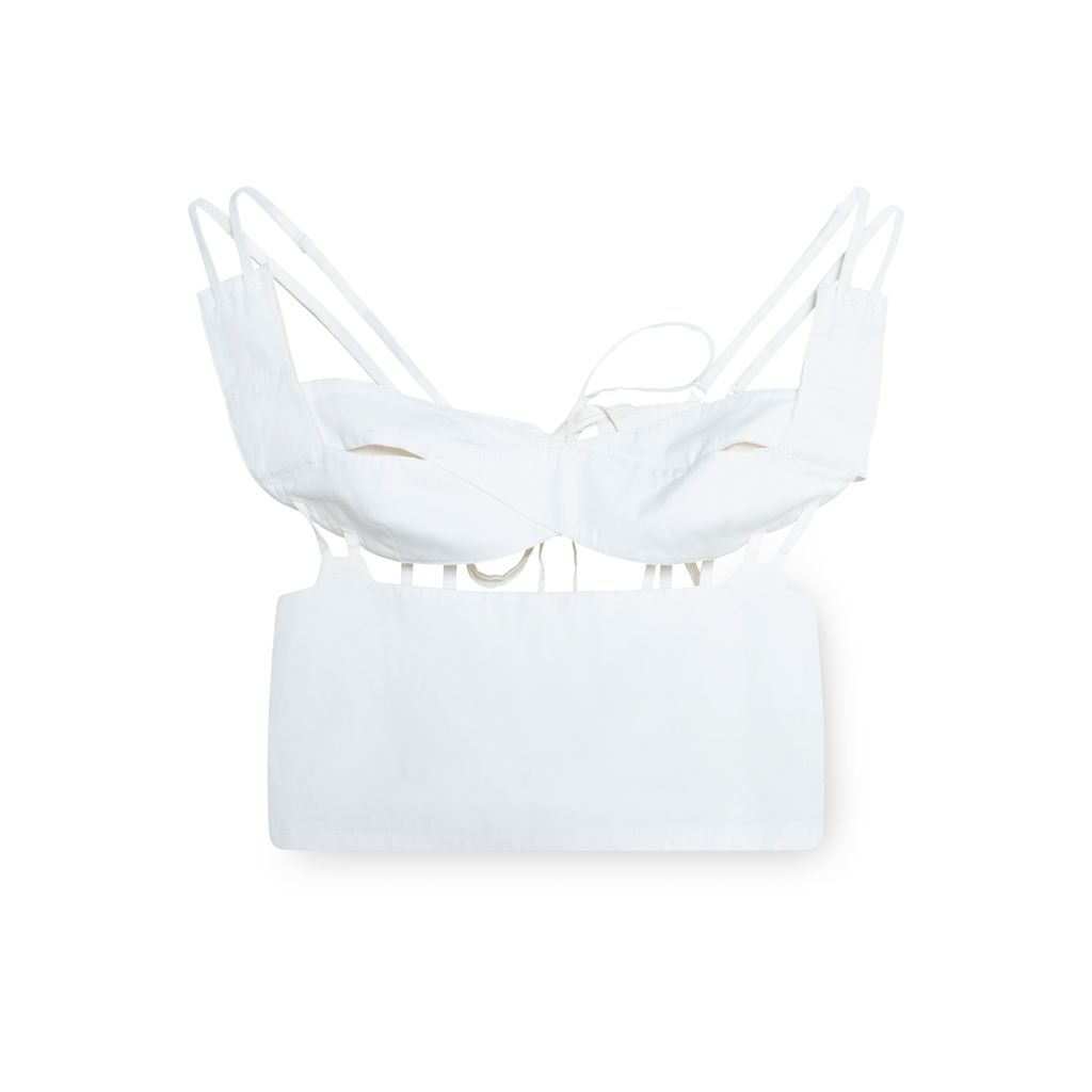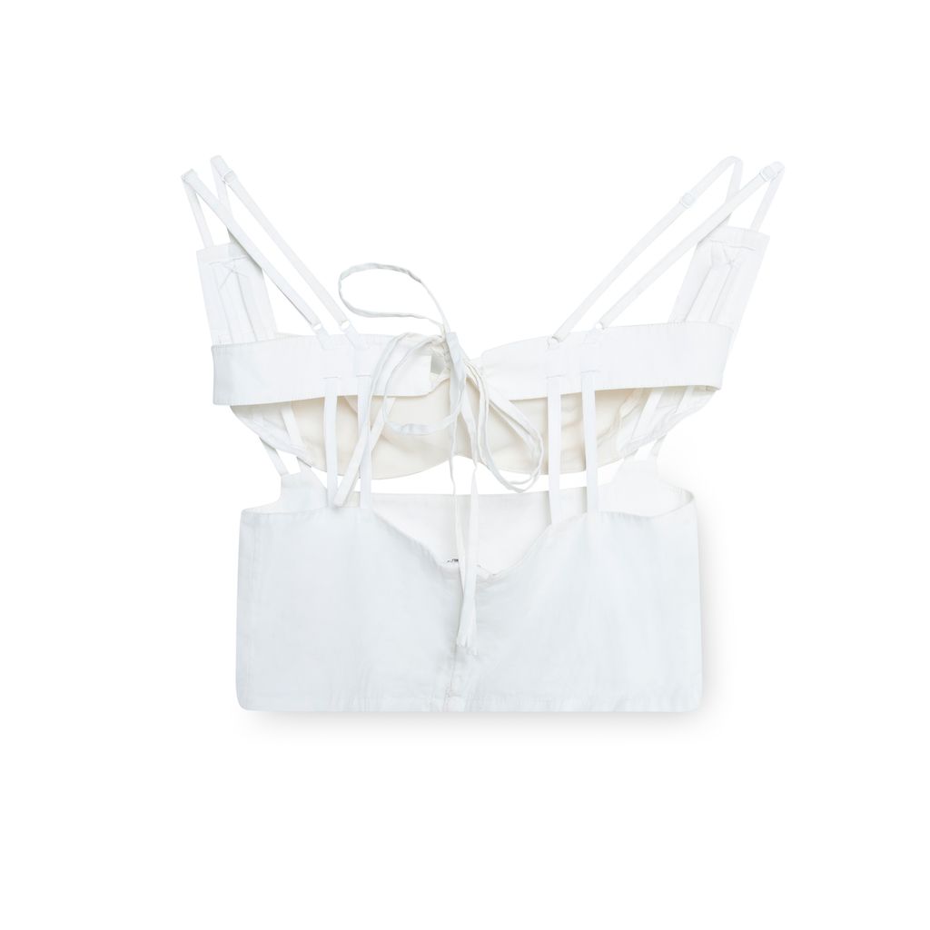 Helmut Lang by Shayne Oliver cutout top features bustier with cut out, adjustable shoulder trap, adjustable traps at back, center zipper at back.