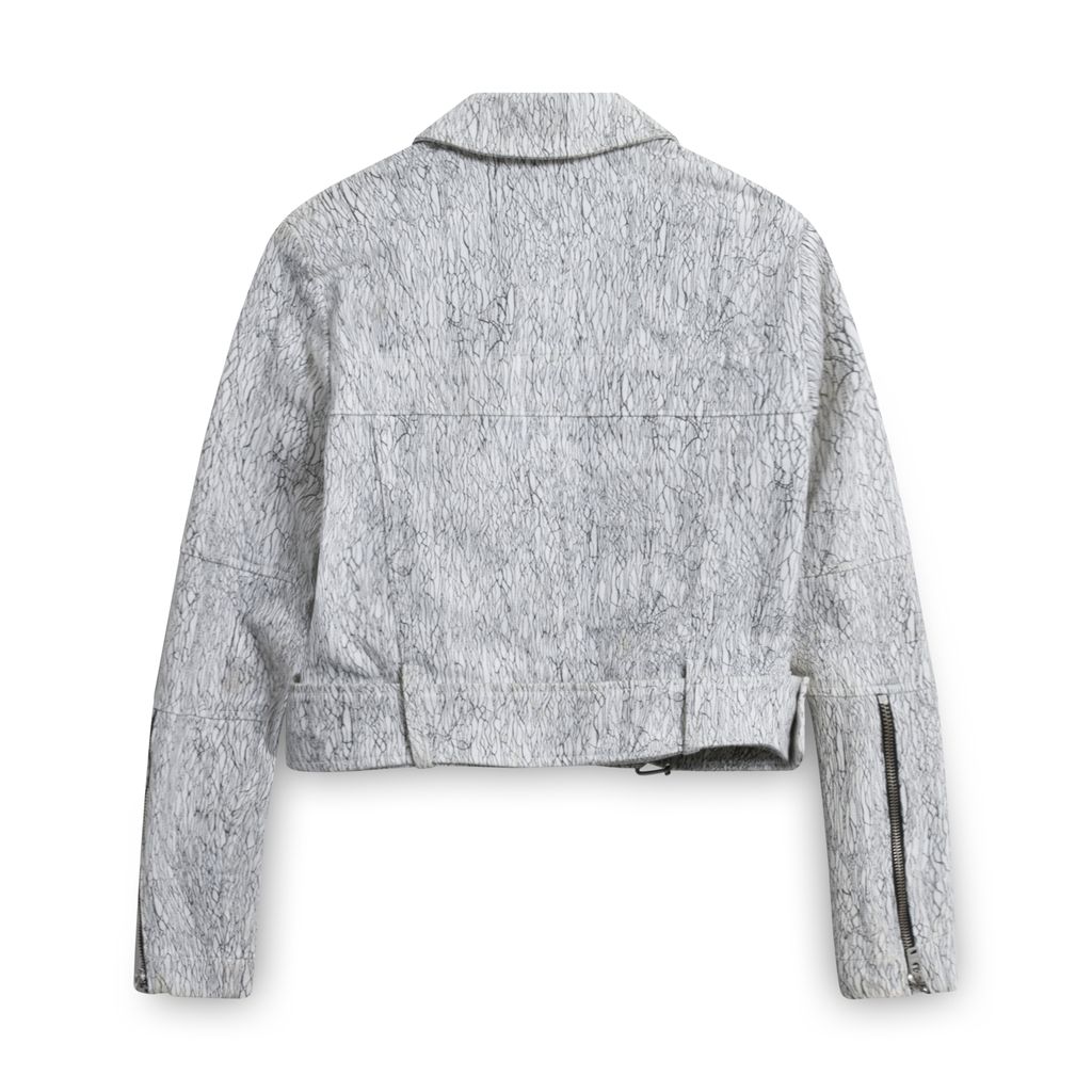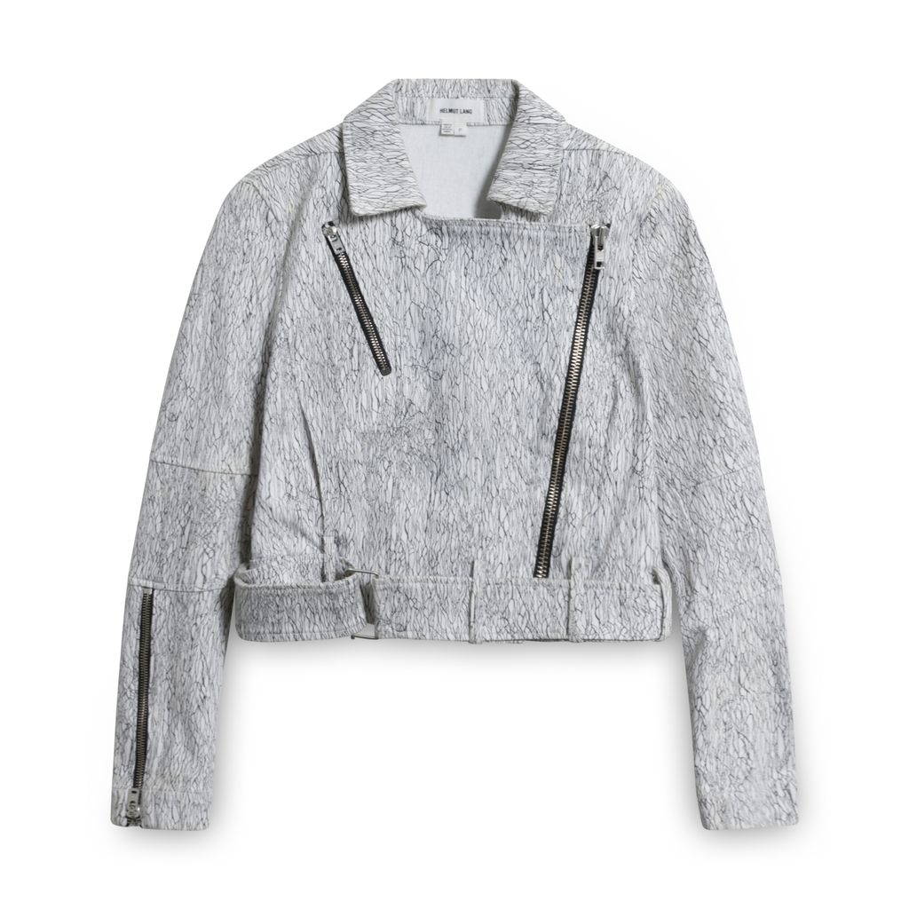 This cotton denim biker style jacket from Helmut Lang features an all over graphic print fabrication, a point collar neckline, an asymmetric double zip with silver hardware details, long sleeves with elongated zippered cuffs, a detachable buckle belt at the hem and has a cropped silhouette. Gently worn, some marks from previous wear, in good condition.