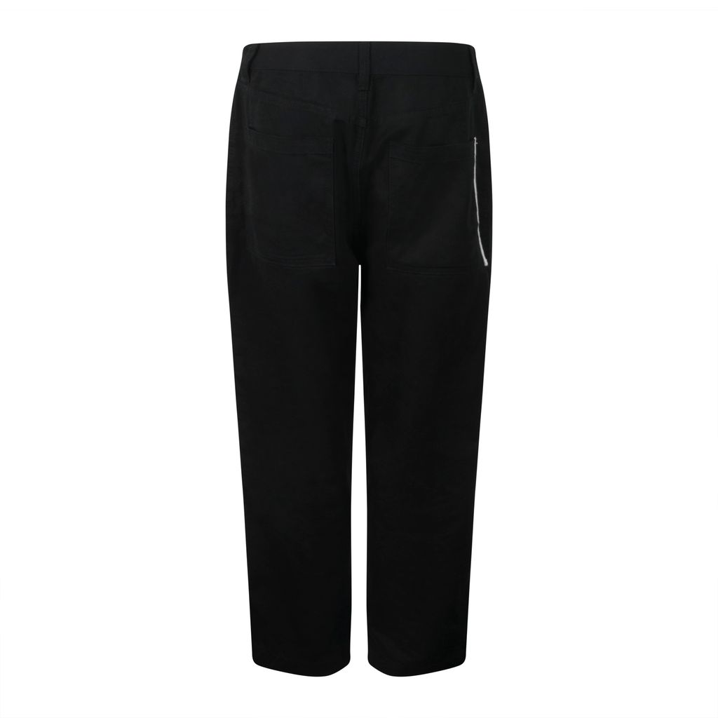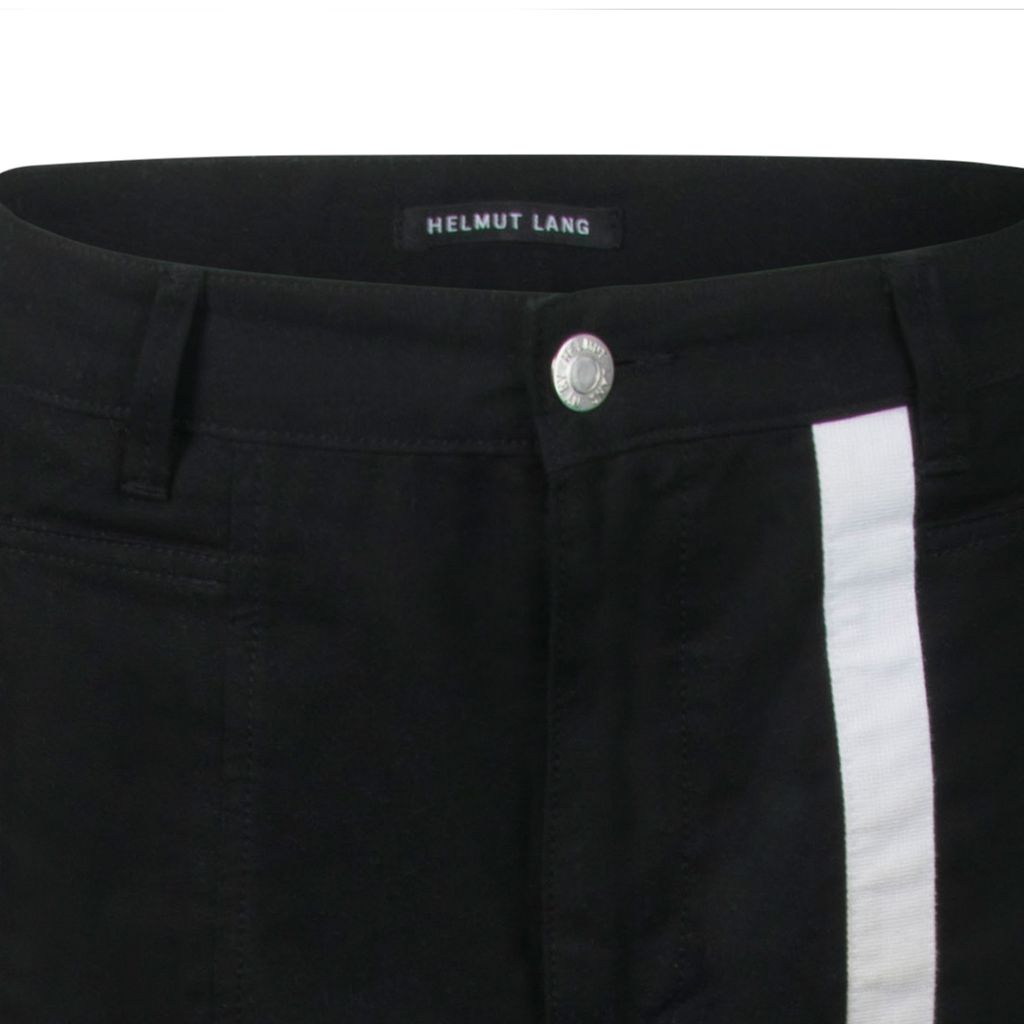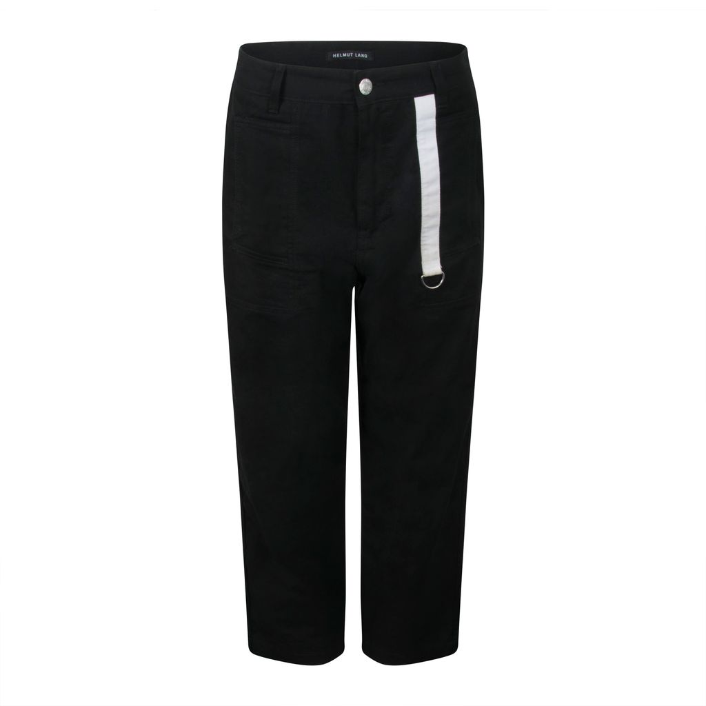 These trousers from Helmut Lang feature a mid-rise waist, front button-fly closure, side pockets, white tab detail, back pockets, and have a cropped silhouette. Helmut Lang branding on back pocket. Gently worn, some discoloration to white tab at front. In good condition.