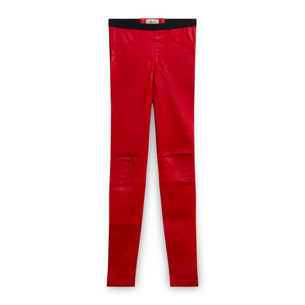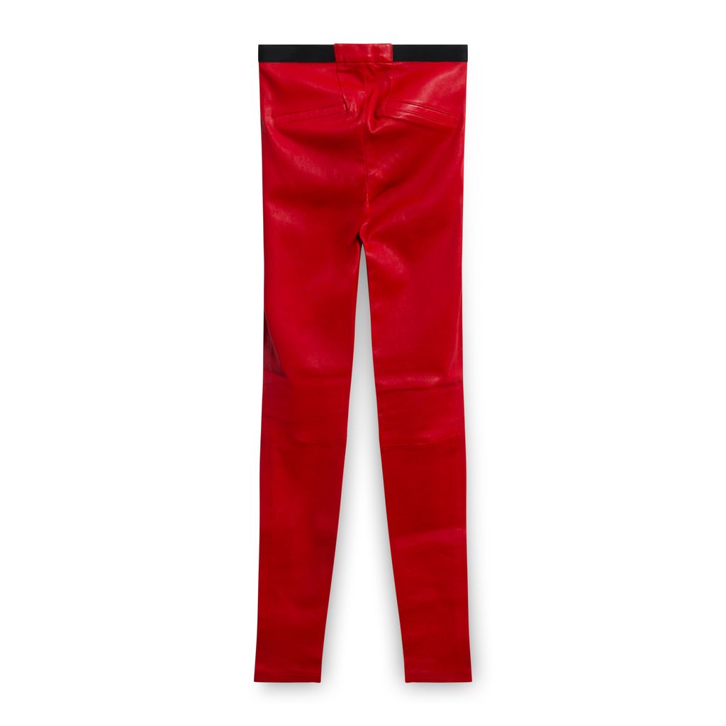 These red leather leggings from Helmut Lang feature an elastic stretch waistband, decorative pockets, and has a fitted silhouette. Gently worn, in good condition, all signs of wear as photographed.