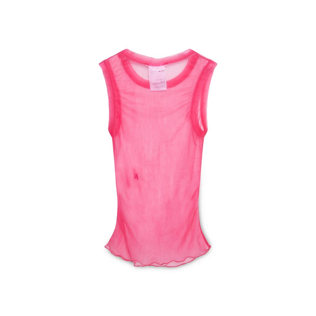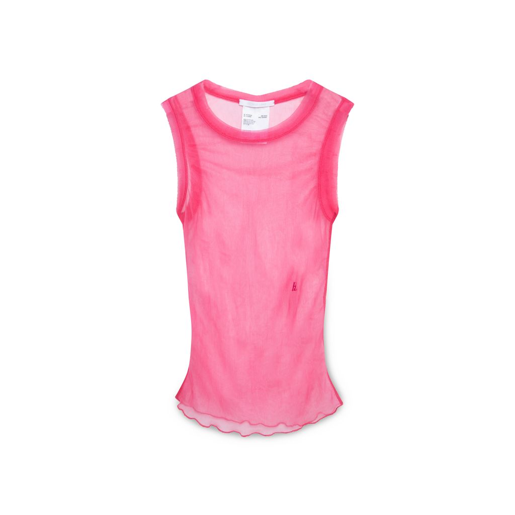 Helmut Lang mesh tulle tank top features round neckline, and embroidered initial at front.