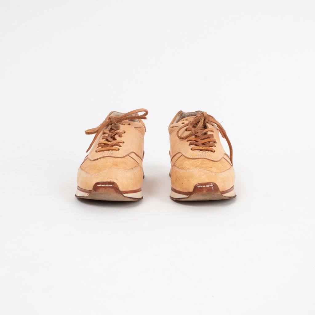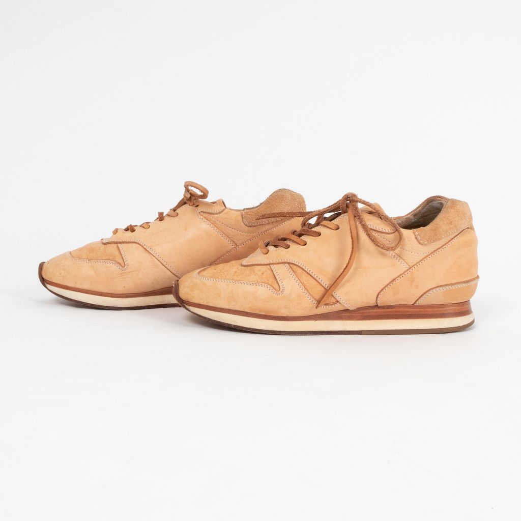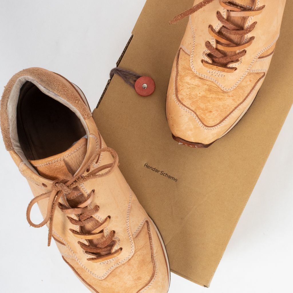 A true wear with anything shoe, these leather trainers from Hender Scheme can be dressed up for work or down for play. Features tan colored leather body fabrication, paneled body design, wraparound suede panel at heel, tonal leather laces, and natural signs of wear including scratches and stains throughout.