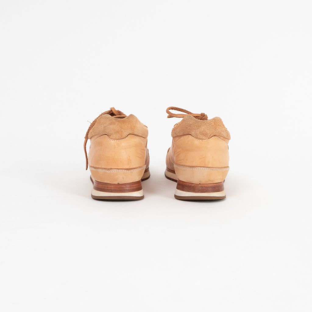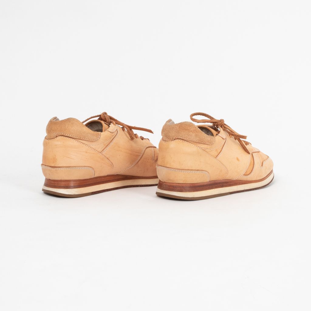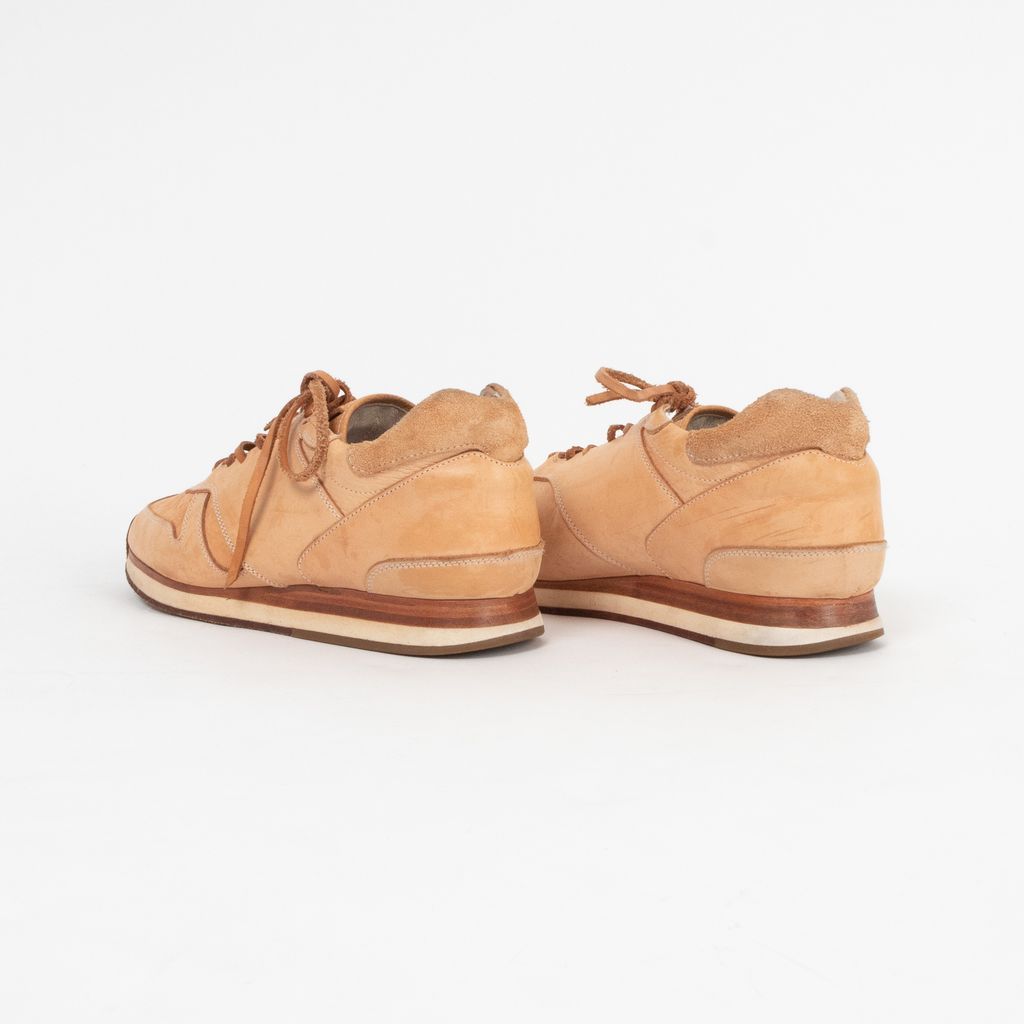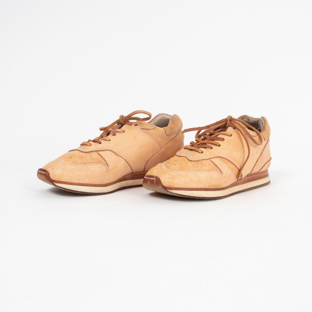 A true wear with anything shoe, these leather trainers from Hender Scheme can be dressed up for work or down for play. Features tan colored leather body fabrication, paneled body design, wraparound suede panel at heel, tonal leather laces, and natural signs of wear including scratches and stains throughout.