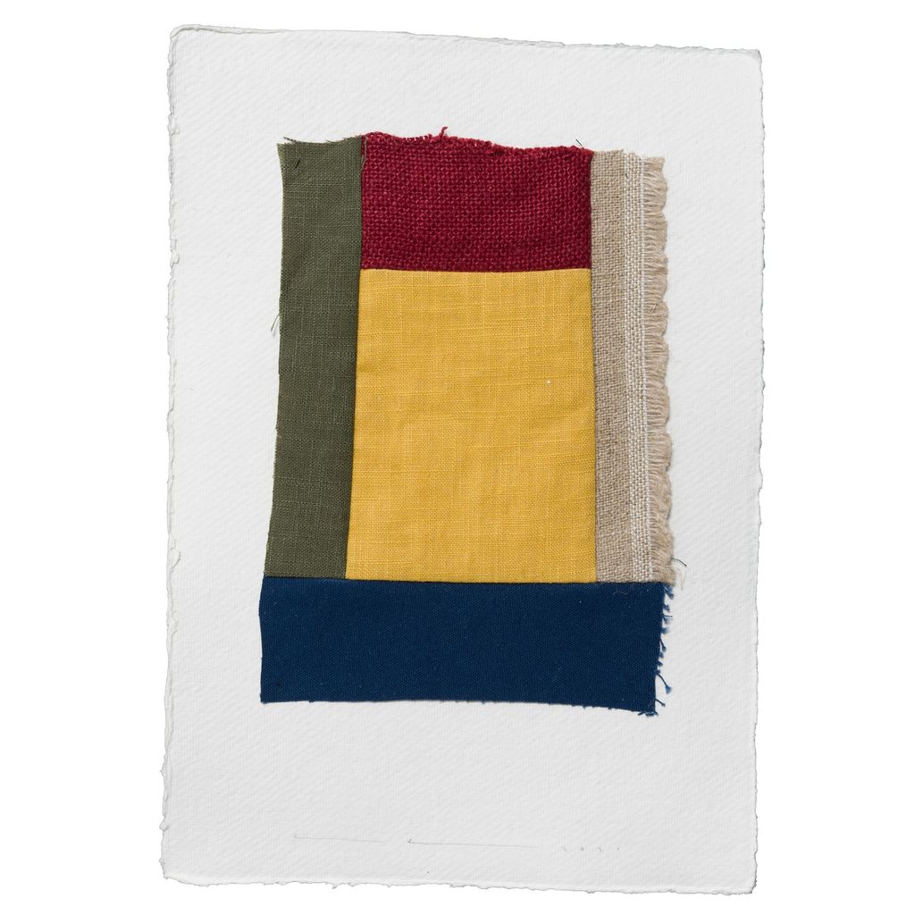Art print that measures 12 x 8.5 inches on quilted linen, canvas, and thread on cotton paper.