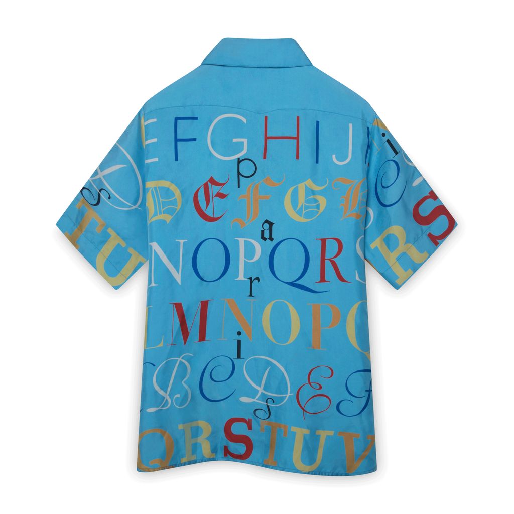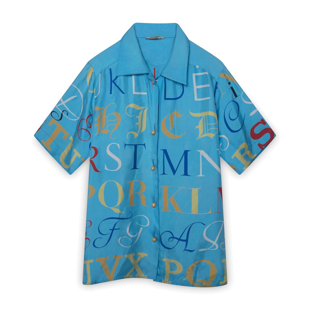 Hermès Literature Alphabet Silk Shirt features alphabet pattern and gold ball buttons.