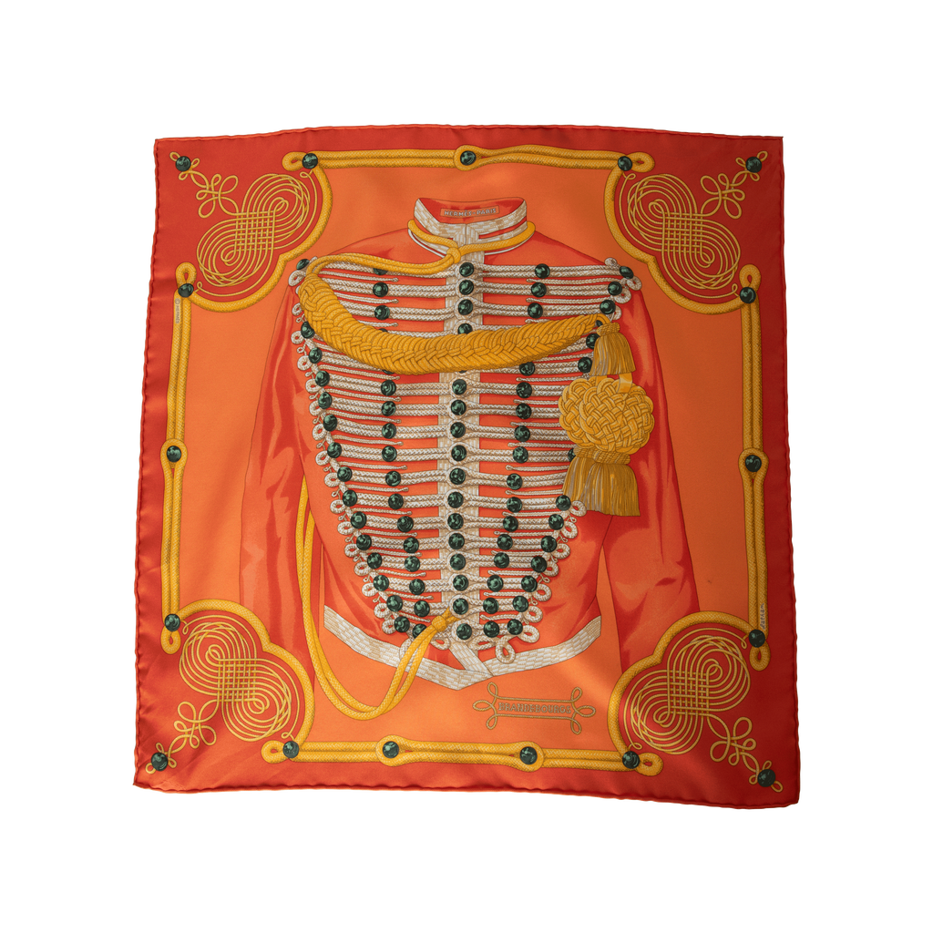 Hermés Orange Brandebourgs Fleuris Pocket Square features double face scarf in silk twill with hand rolled edges.