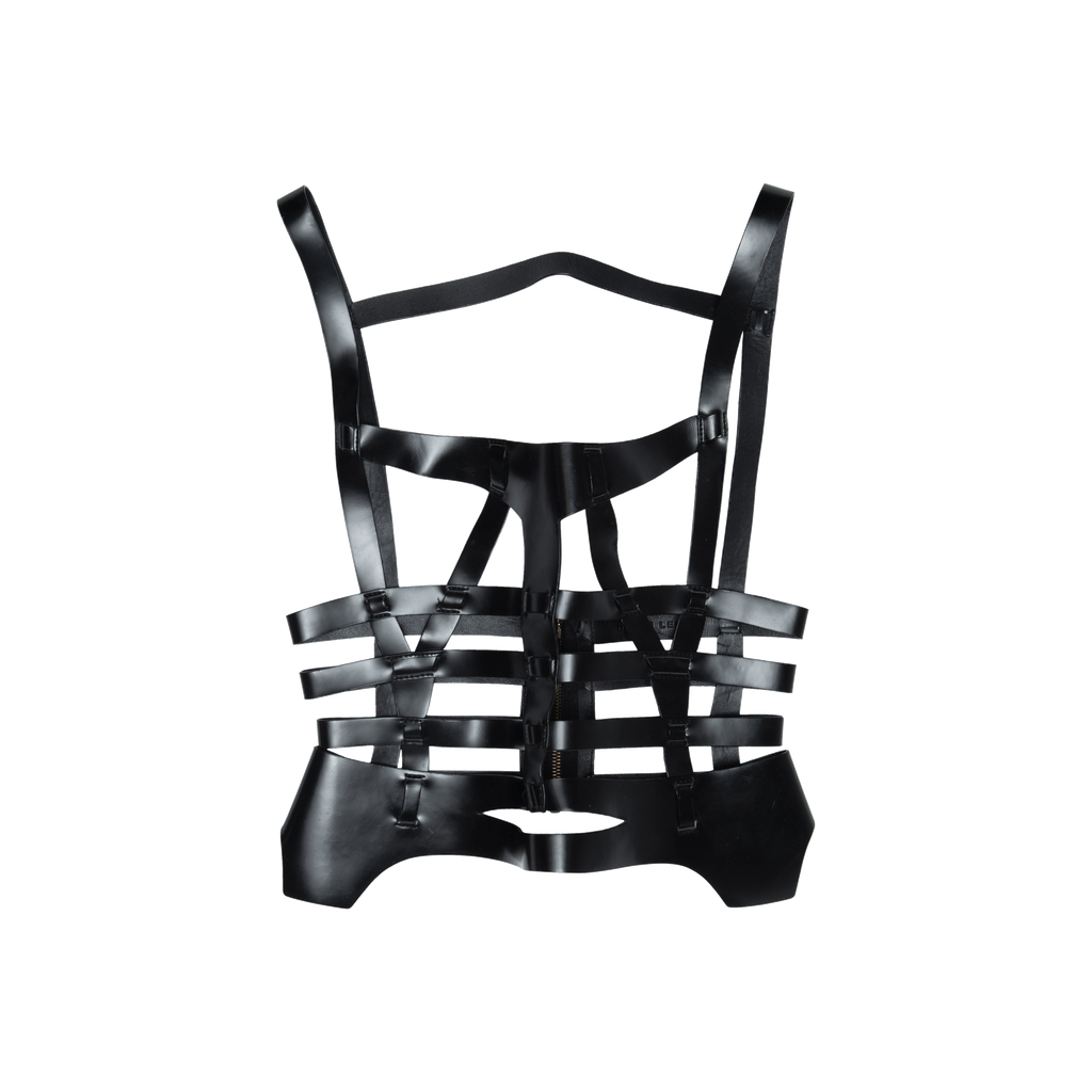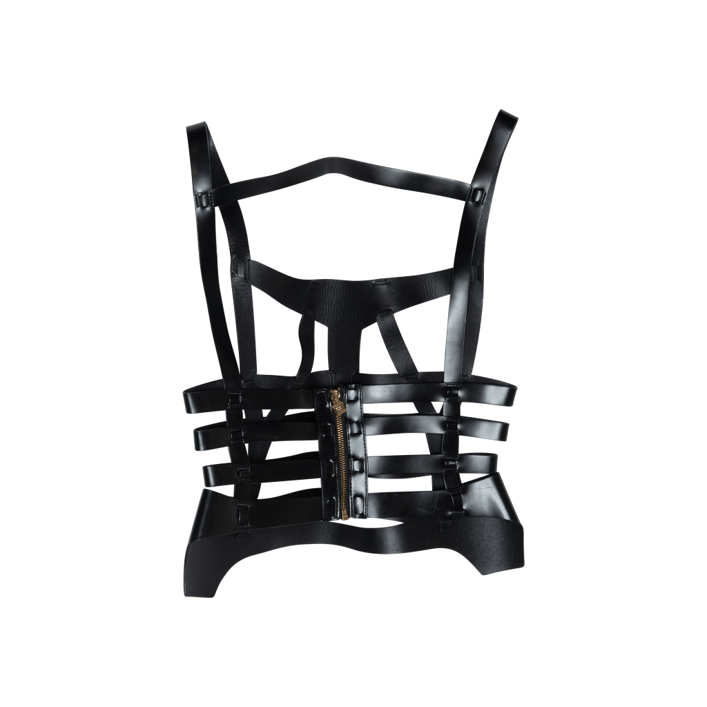 Herve Leger Black Leather Harness features back zipper with gold hardware and caged ribs and bust design.