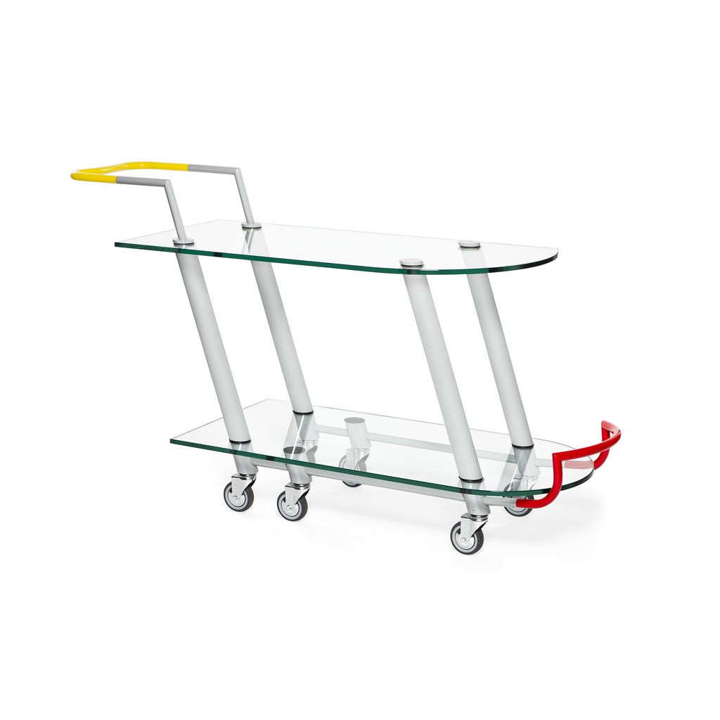 Hilton, designed by Javier Mariscal in 1981, is a trolley that seems ready to run. Even standing still, it seems to pick up speed with its slight angle, as if it were part of a cartoon. This piece was designed, by invitation of Ettore Sottsass, for the very first Memphis collection.