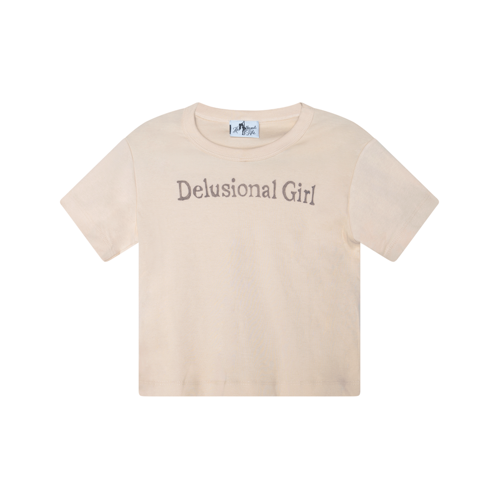 Hollywood Gifts Baby Tee features 'Delusional Girl' graphic on front and cropped fit.