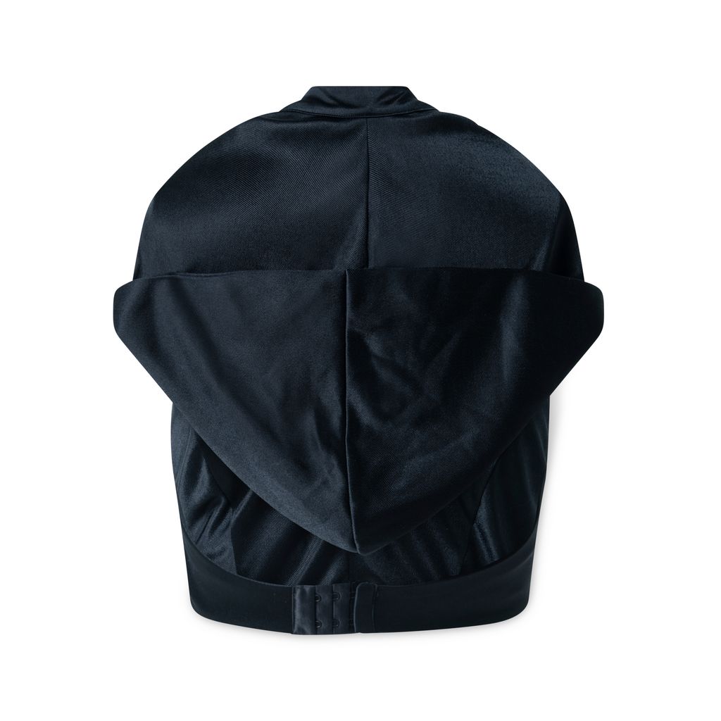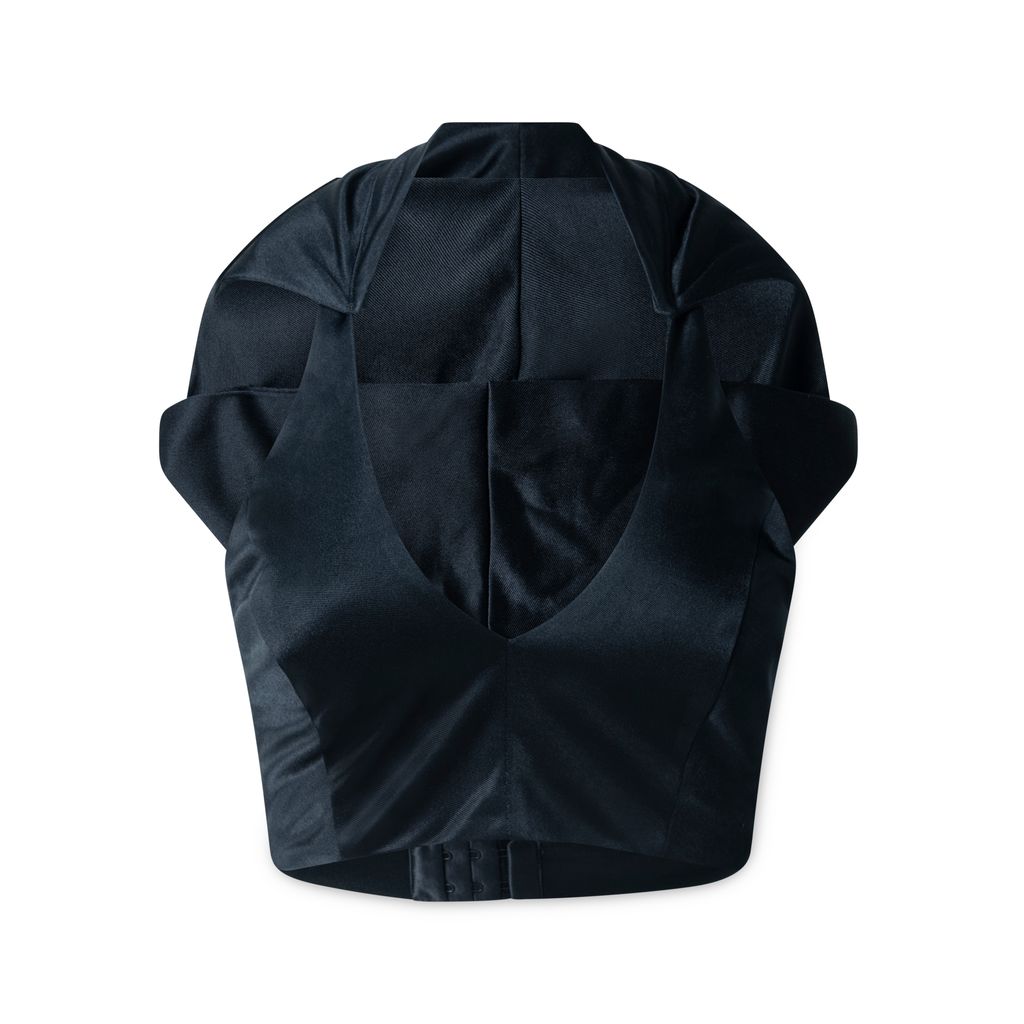 A sleek V-neck halter top with a hood to activate the incognito mode. Made in a silky lux fabric with an adjustable hook & eye closure in the back. Pair it with the Asymmetrical Thong Skirt.