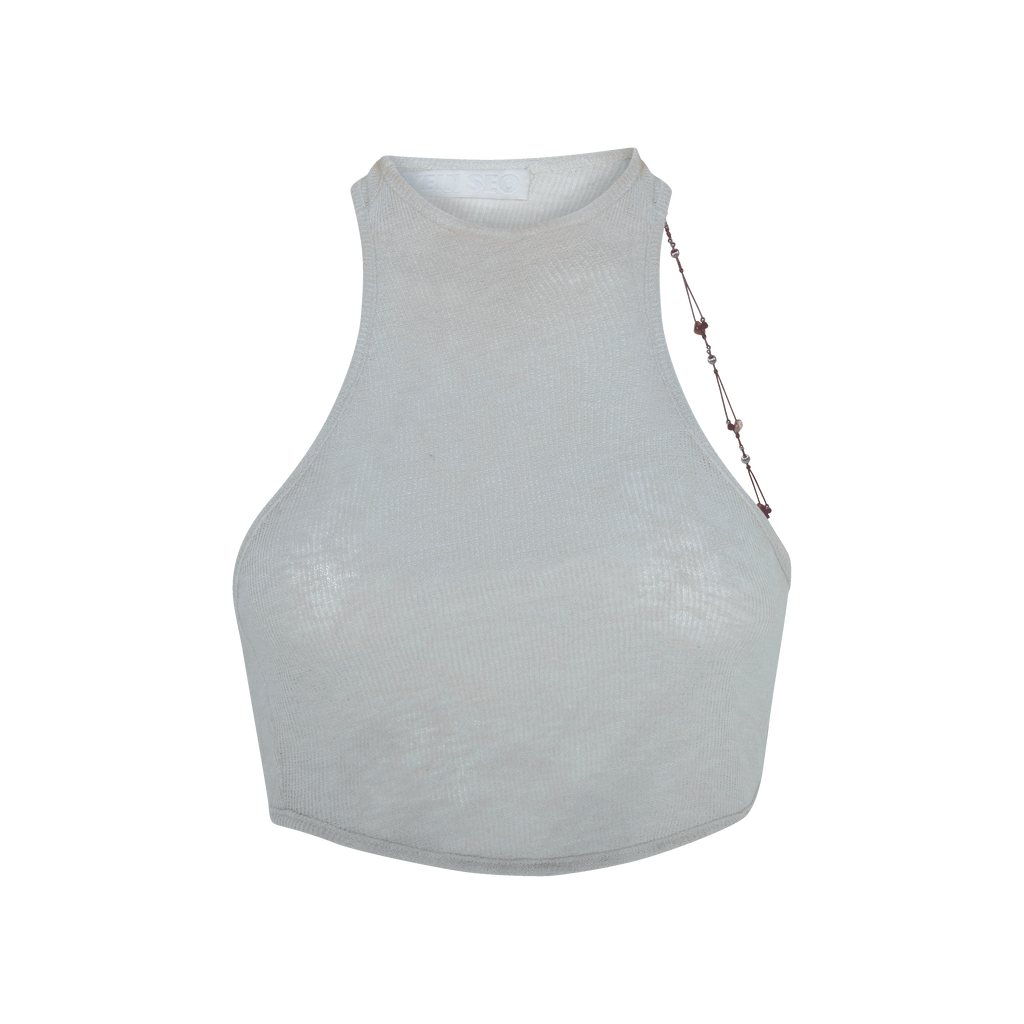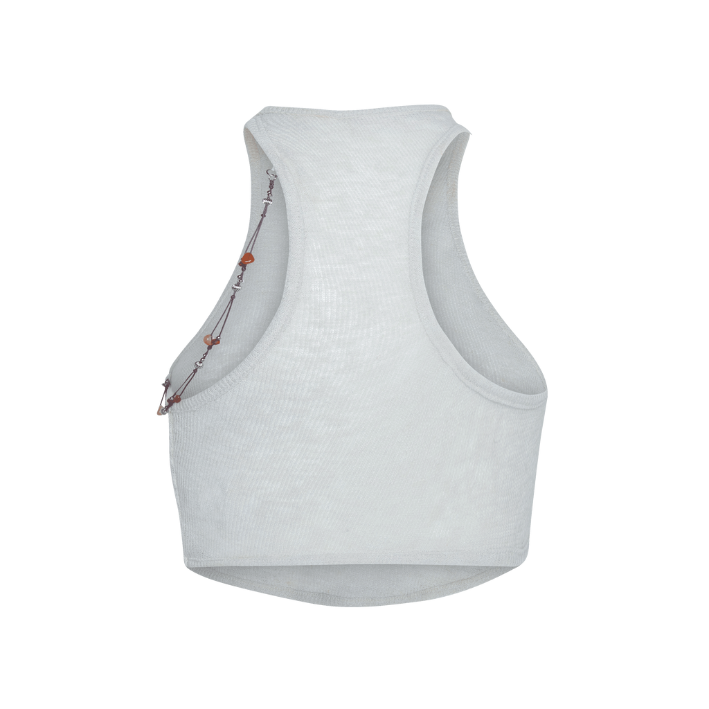 Hyein Seo Cream Crescent Tank features ribbed jersey material, asymmetric design, and beaded strap.
