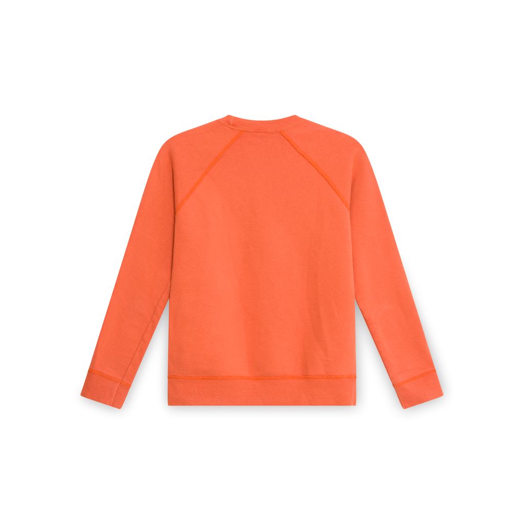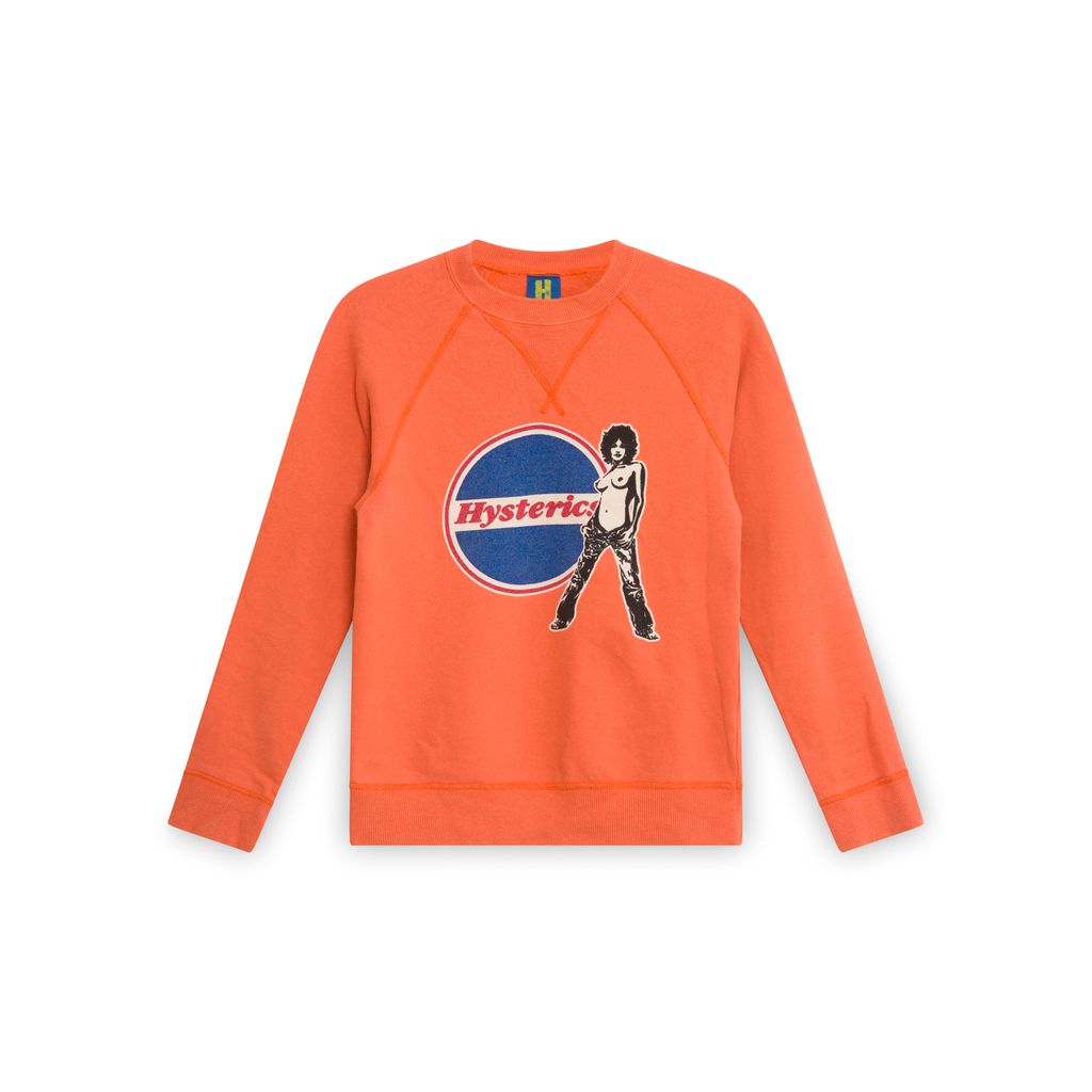 Hysteric Glamour Orange Crewneck Sweater features printed graphic on front, ribbing at collar, wrists, and hem.