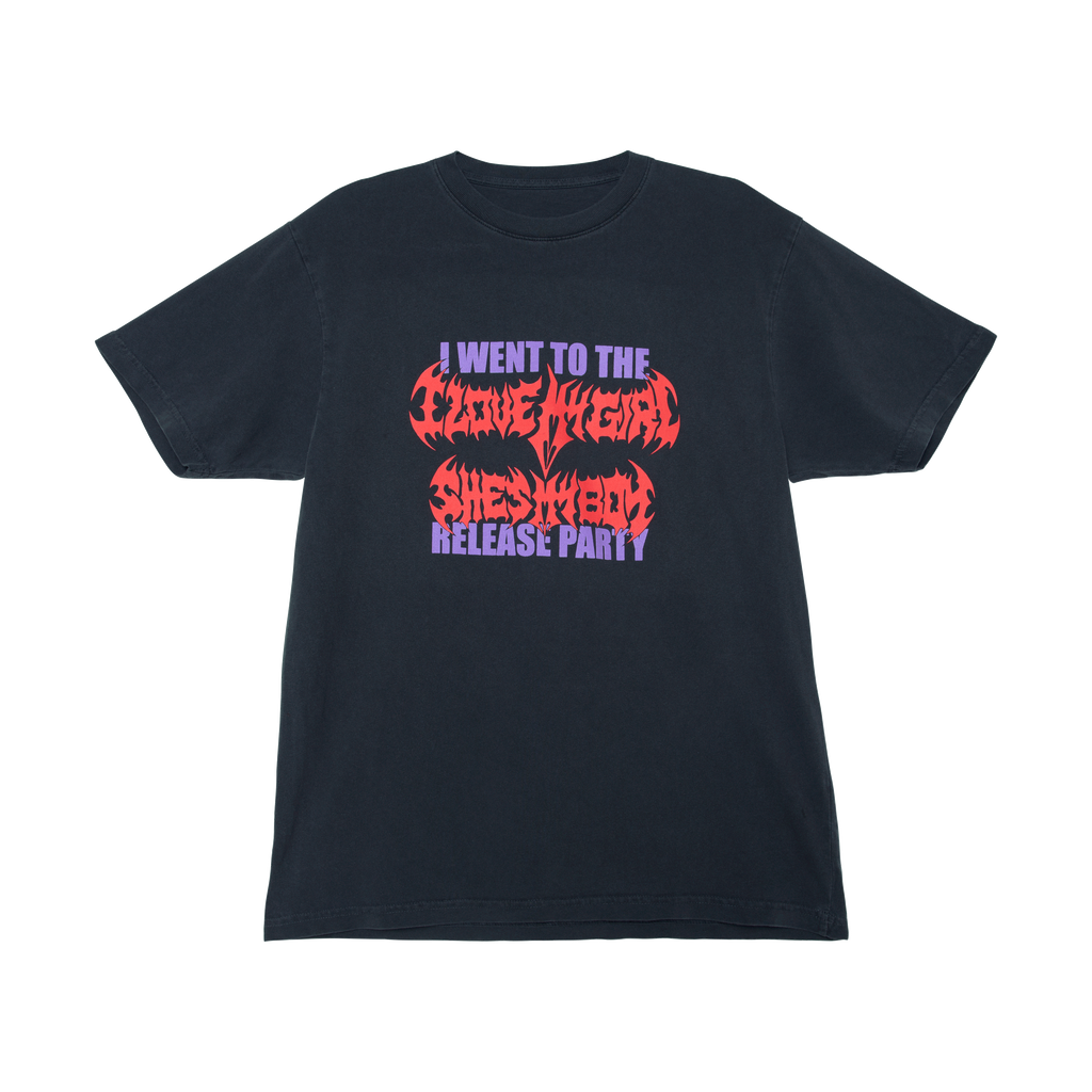 'I Love My Girl, She's My Boy' Release Party Tee features graphic on front and back.