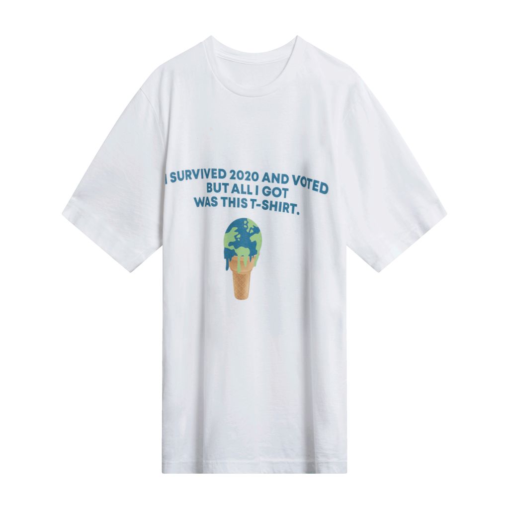 Features "I survived 2020" text and ice cream earth graphics on the front and Shirt App text and graphics on the back