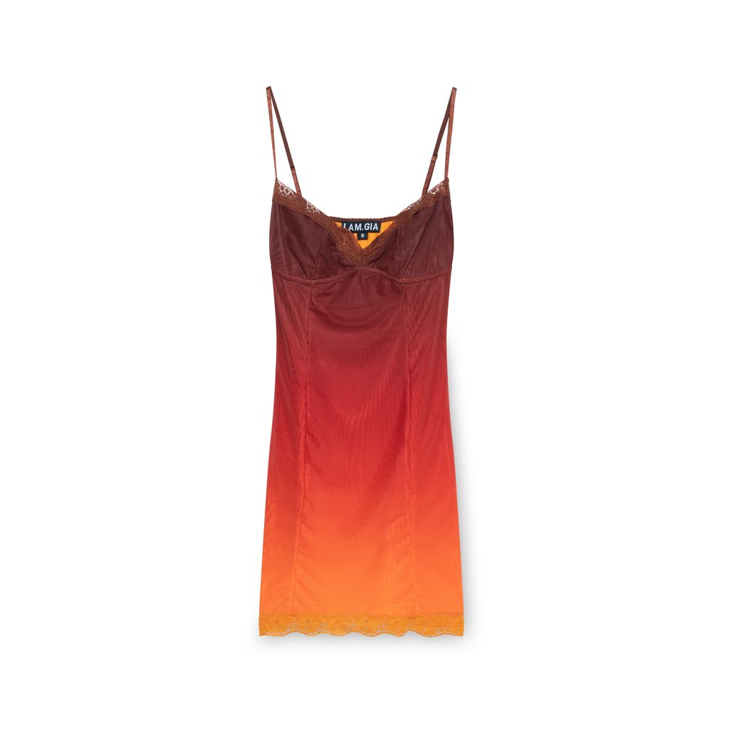 I.AM.GIA Sunset Cami Mini Dress features lace trim, adjustable spaghetti straps, mesh outer, and sweetheart neckline.