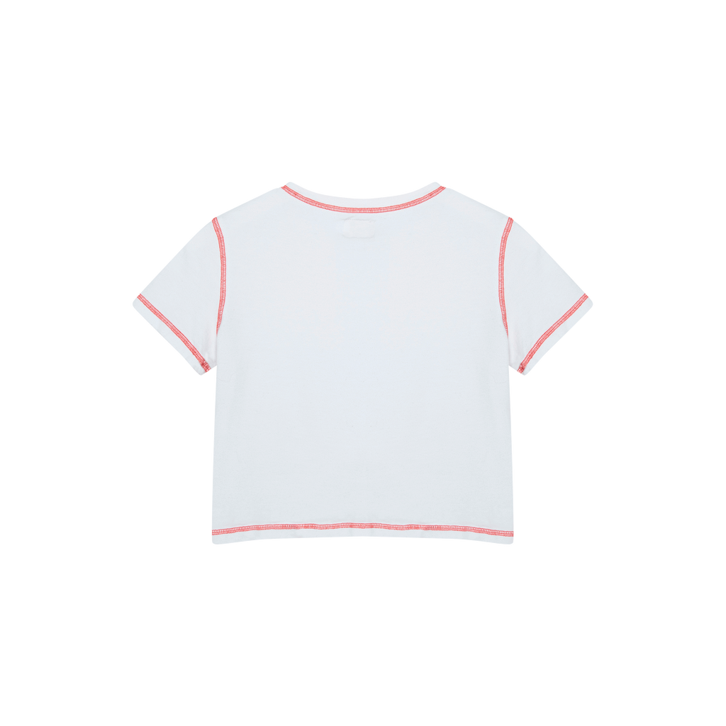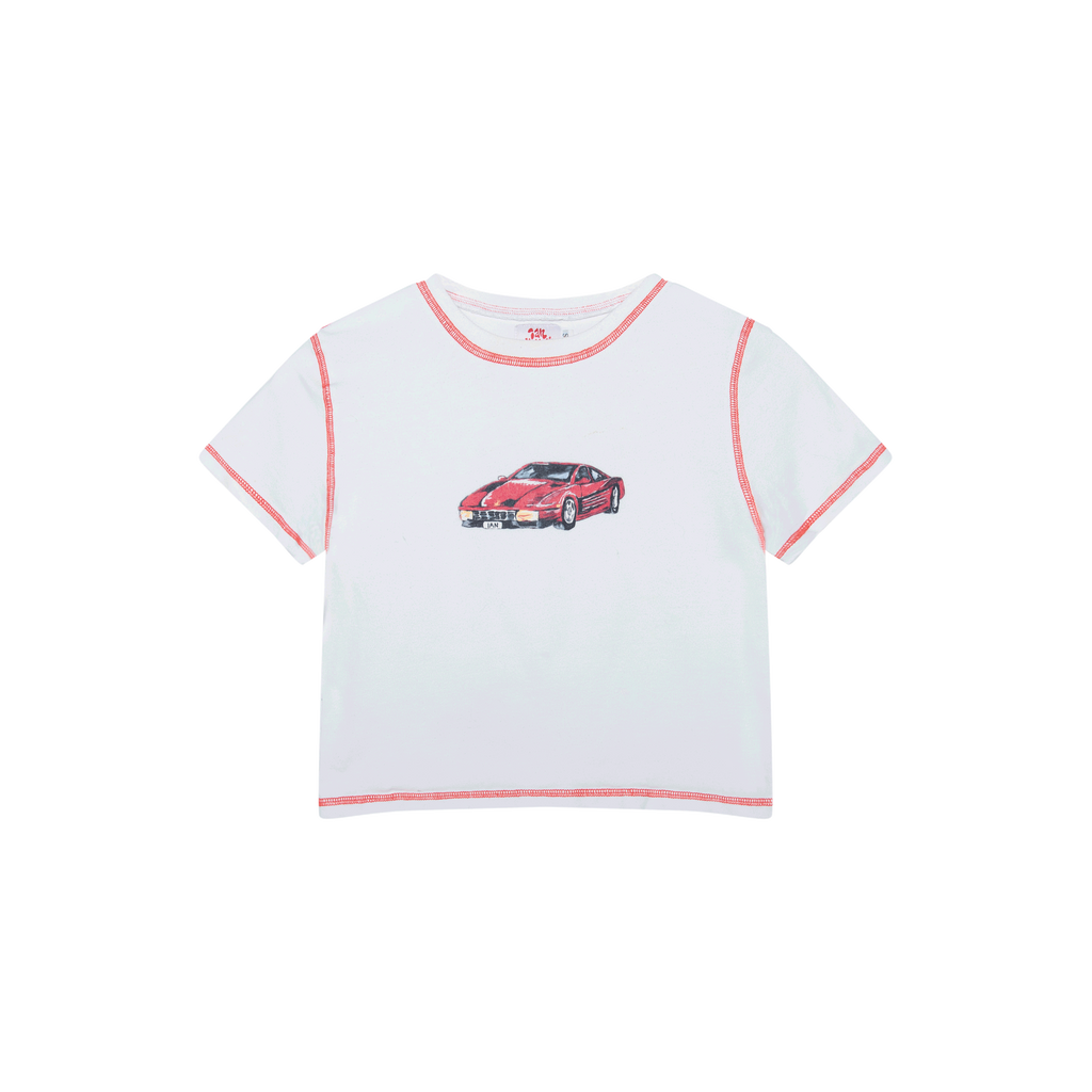 Ian Charms Car Baby Tee features car graphic on front, red contrast stitching, and cropped fit.