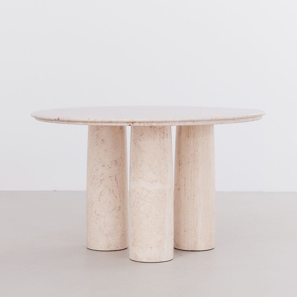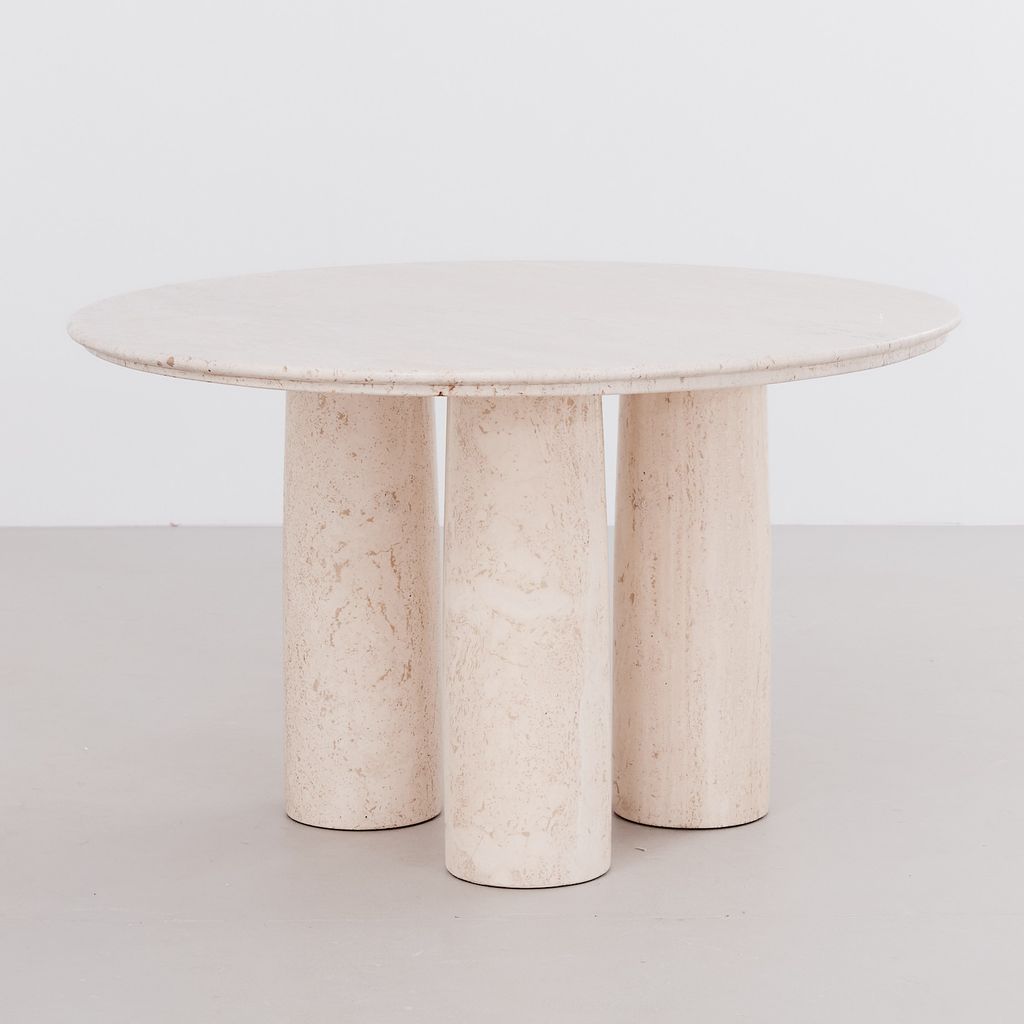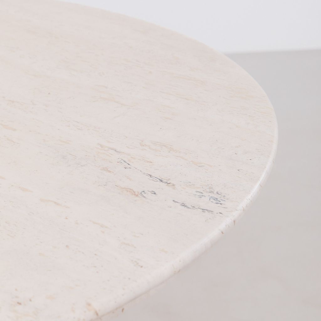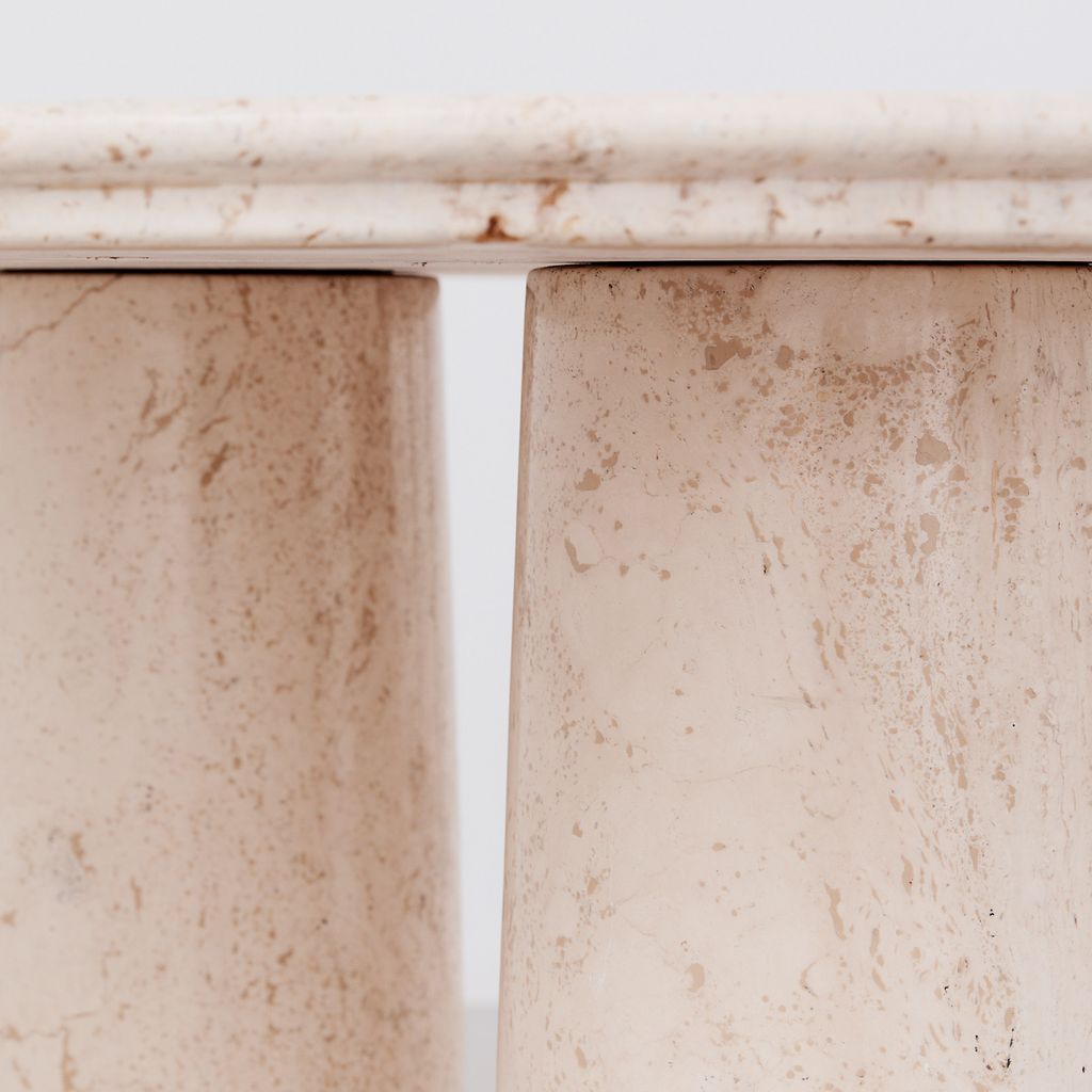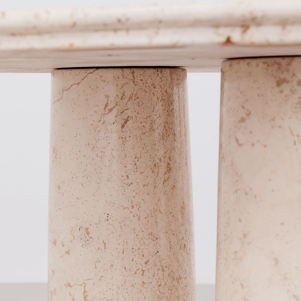 The classic Il Colonnato dining table by Mario Bellini for Cassina. Designed in 1977, this collectible design features the distinctive tapered column legs in cream toned travertine, with soft polished finish.