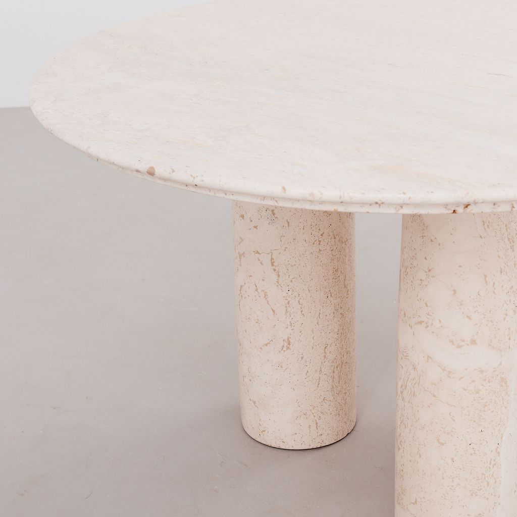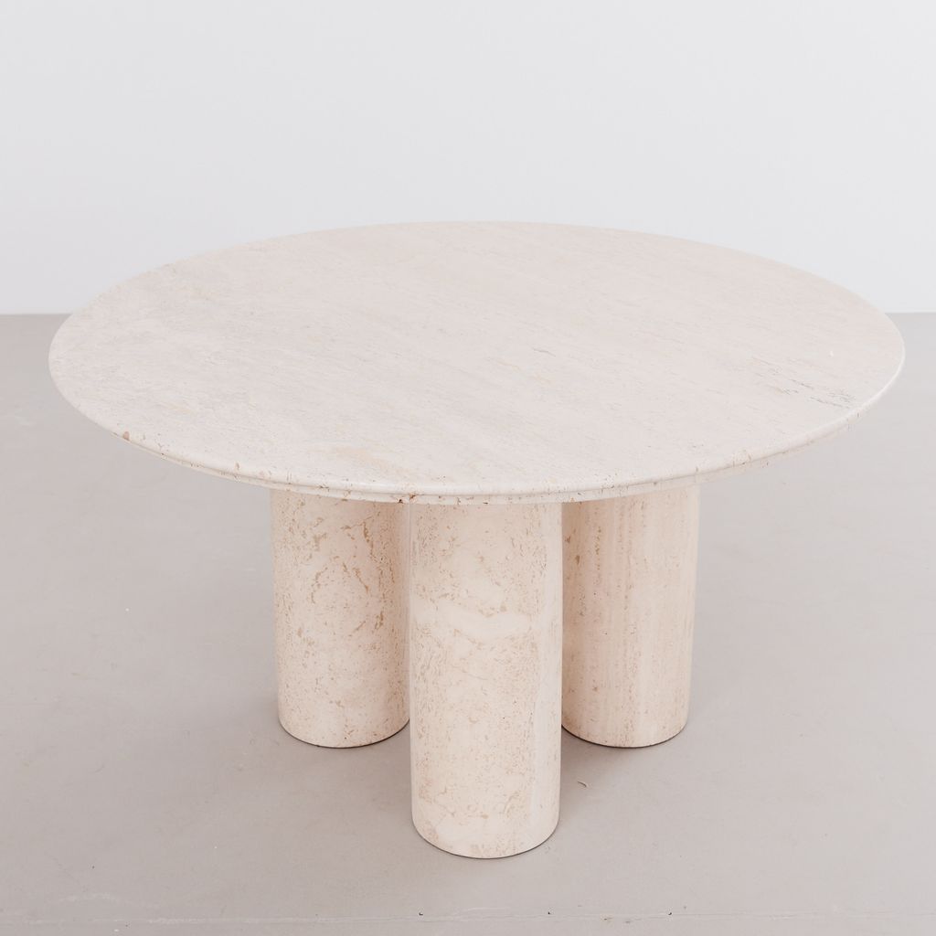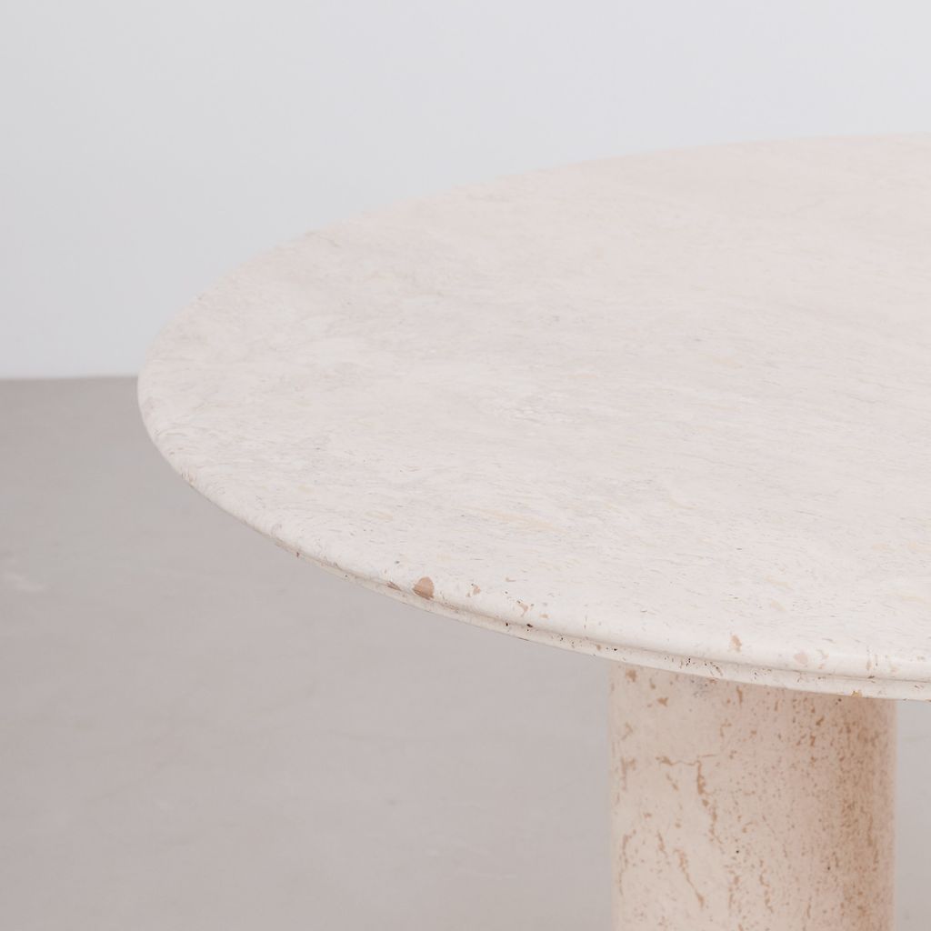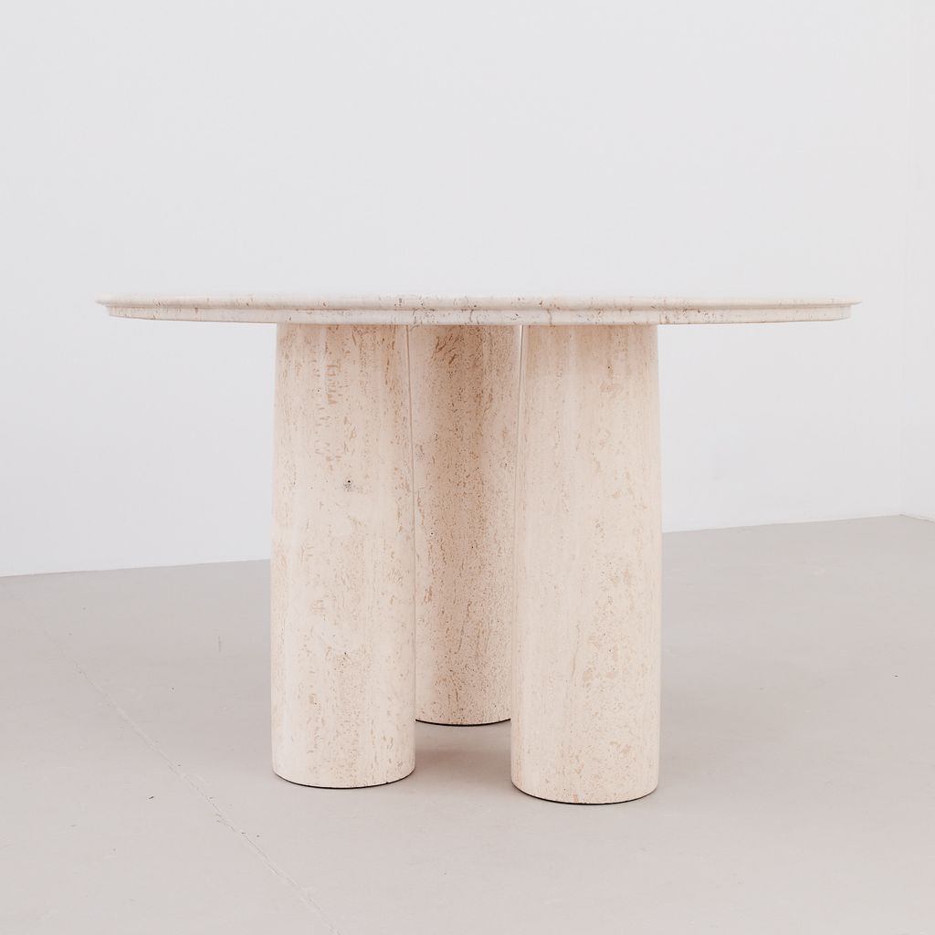 The classic Il Colonnato dining table by Mario Bellini for Cassina. Designed in 1977, this collectible design features the distinctive tapered column legs in cream toned travertine, with soft polished finish.