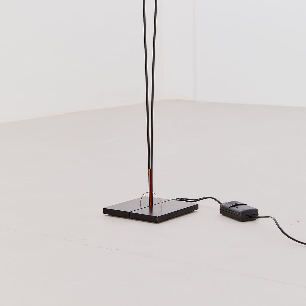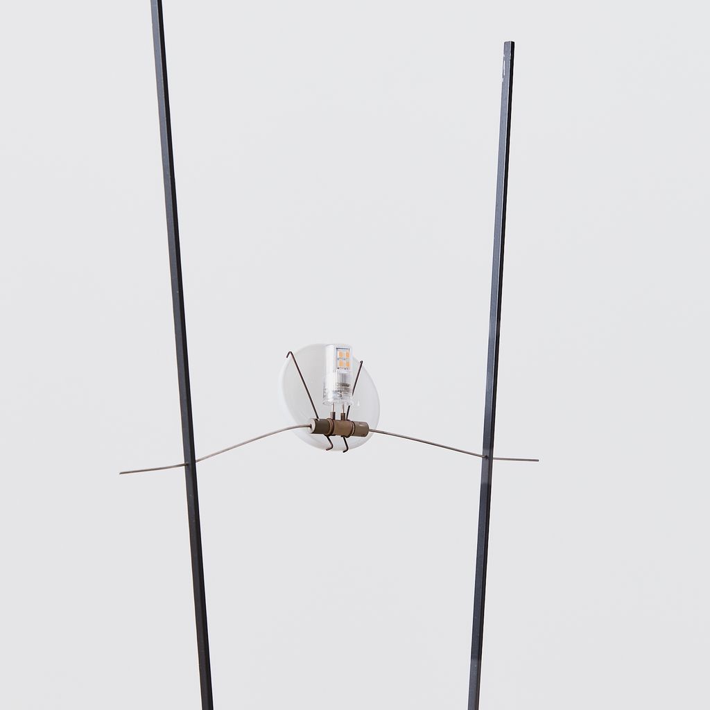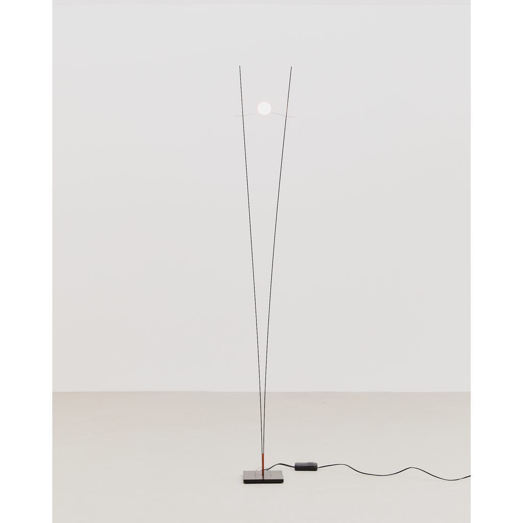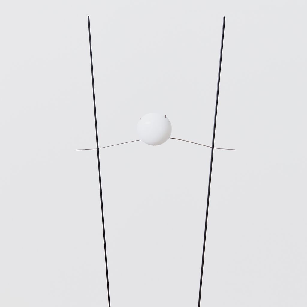 Original minimalist Ilios floor lamp by Franz Ringelhan for Ingo Maurer. This classic model, first designed in 1973 features two thin metal rods, holding the bulb and white metal shade in suspension. Designer: Franz Ringelhan Manufacturer: Ingo Maurer