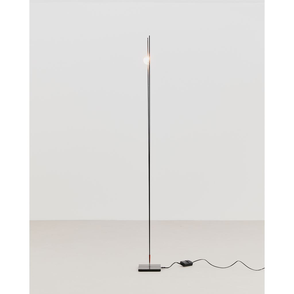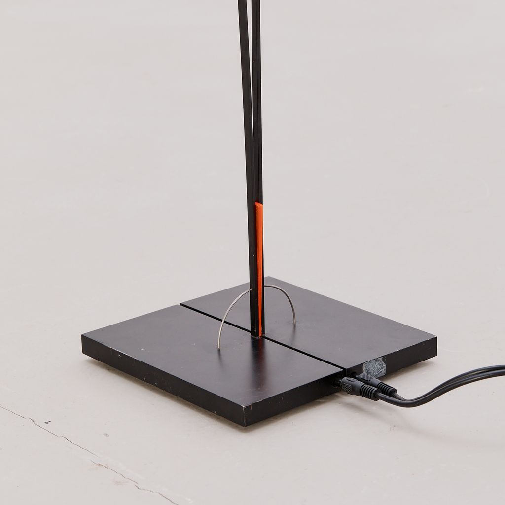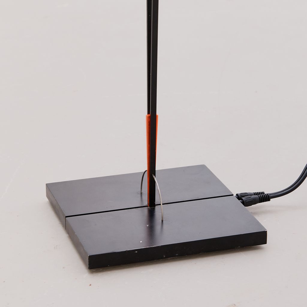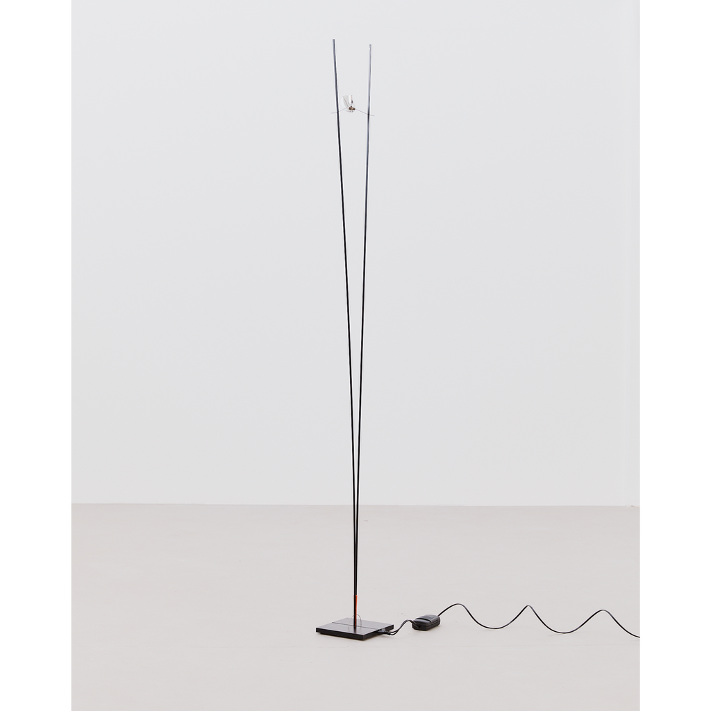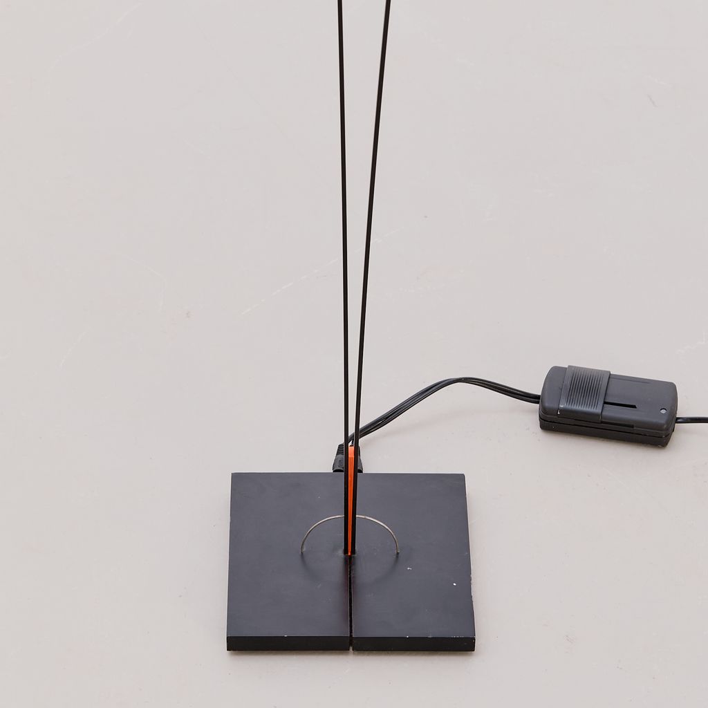 Original minimalist Ilios floor lamp by Franz Ringelhan for Ingo Maurer. This classic model, first designed in 1973 features two thin metal rods, holding the bulb and white metal shade in suspension. Designer: Franz Ringelhan Manufacturer: Ingo Maurer