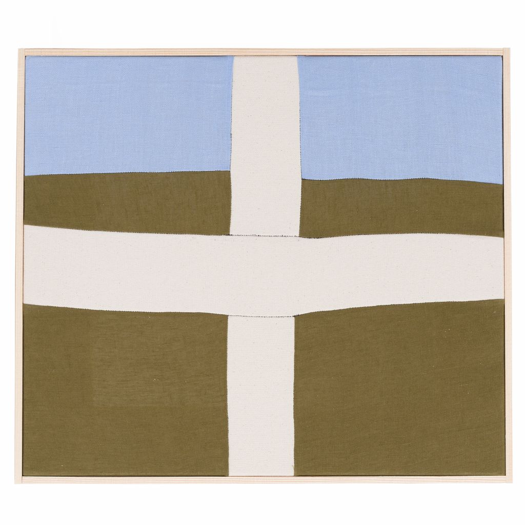Painting that measures 14.5 x 16.5 inches on quilted linen and canvas. Framed in pine and brass brad.