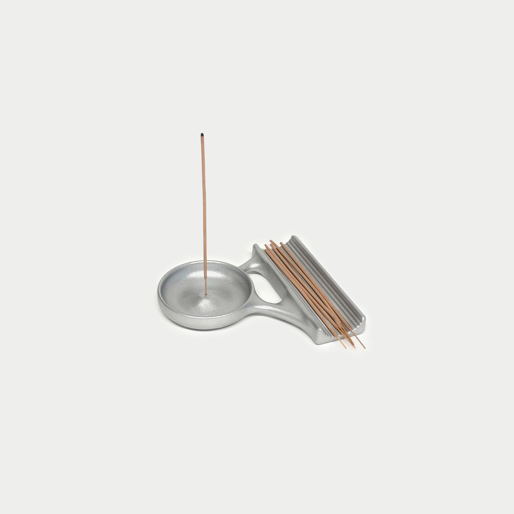 Cast in aluminium, this incense holder balances utility with sculptural form. Its dual design features a circular dish for catching ash and an integrated rest for storing incense sticks. Designed to bring calm and order to everyday rituals.