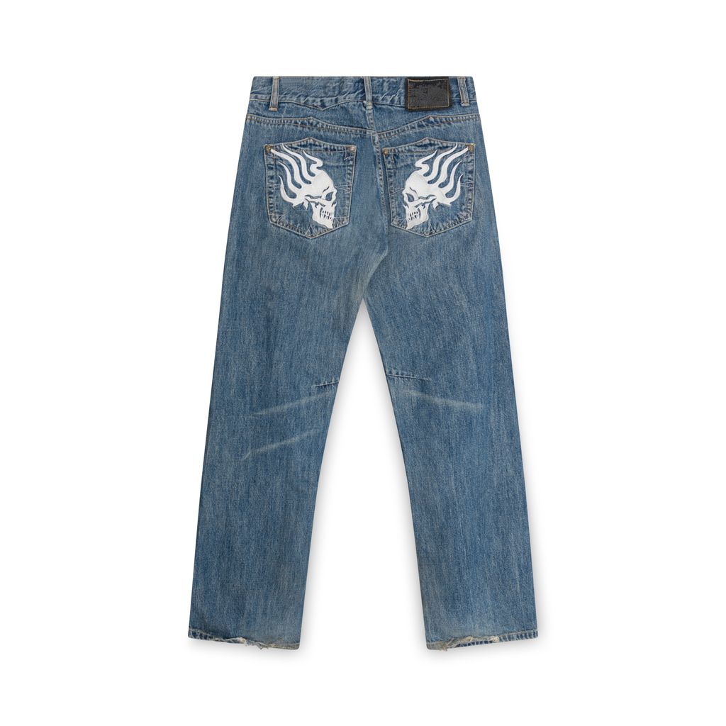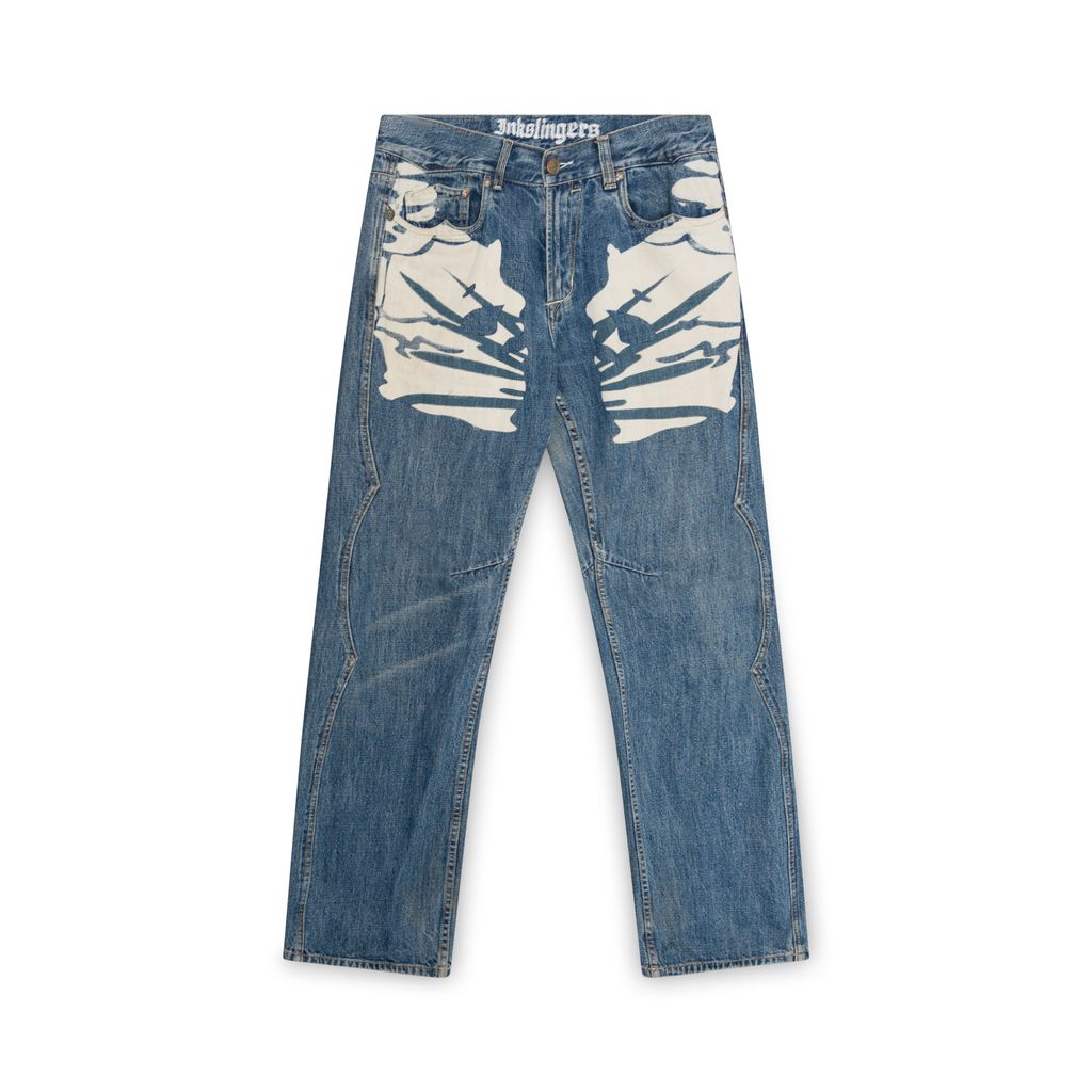 Inkslingers Skull Jeans features white graphic on front of pants, 5 pocket style, zip and button fly closure, button features skull design, logo patch on back waistband, embroidered skull graphic on back pockets.