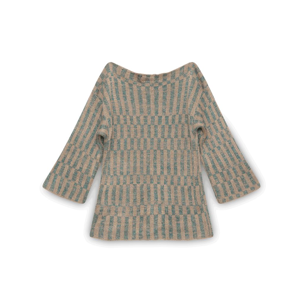 Intensity Crochet Long Sleeve Top features two side pockets, wide collar, blue and silver pattern throughout.