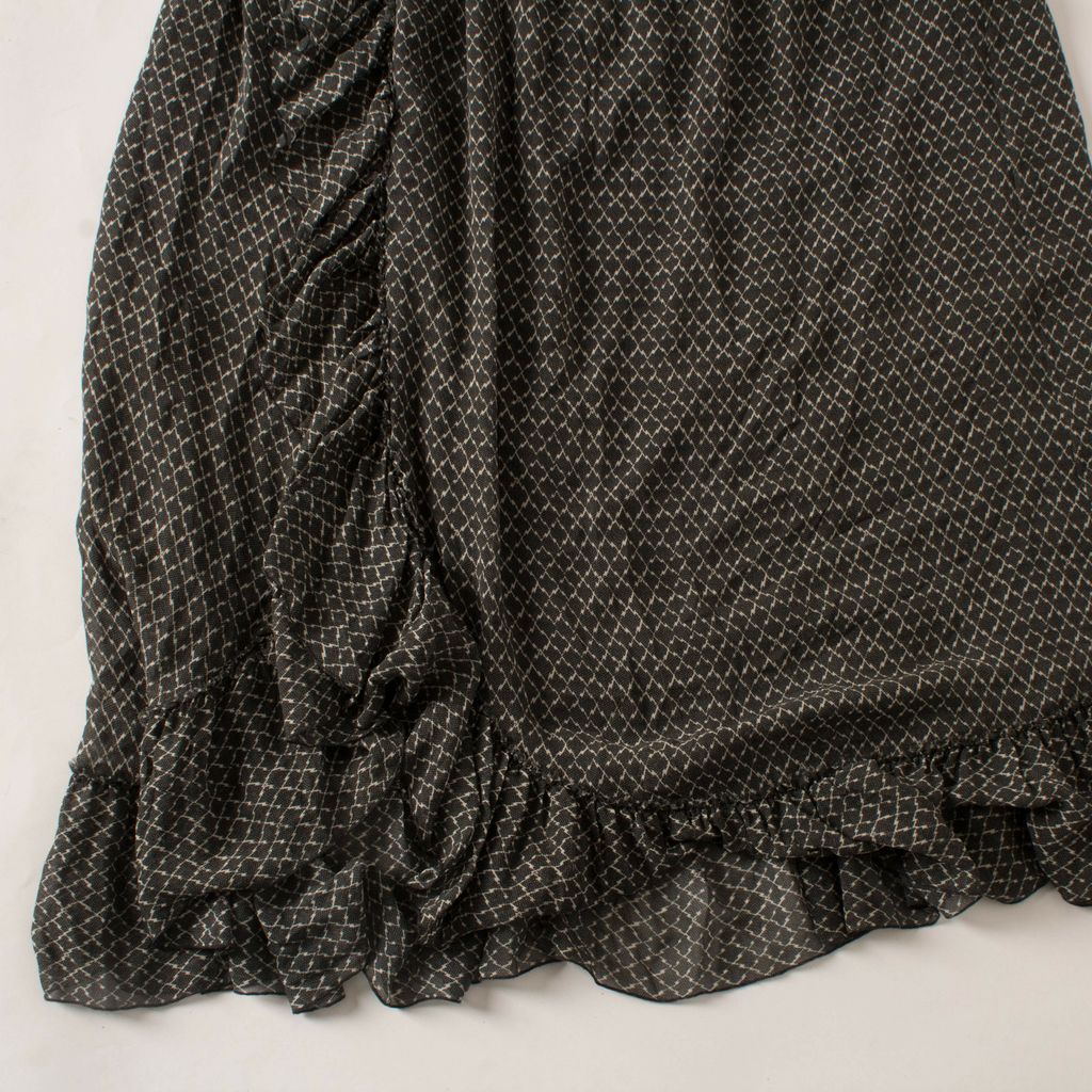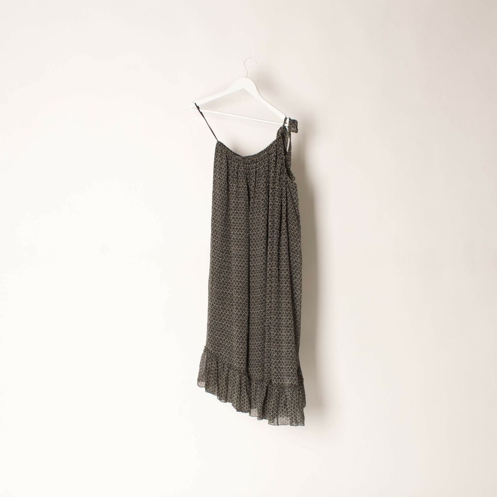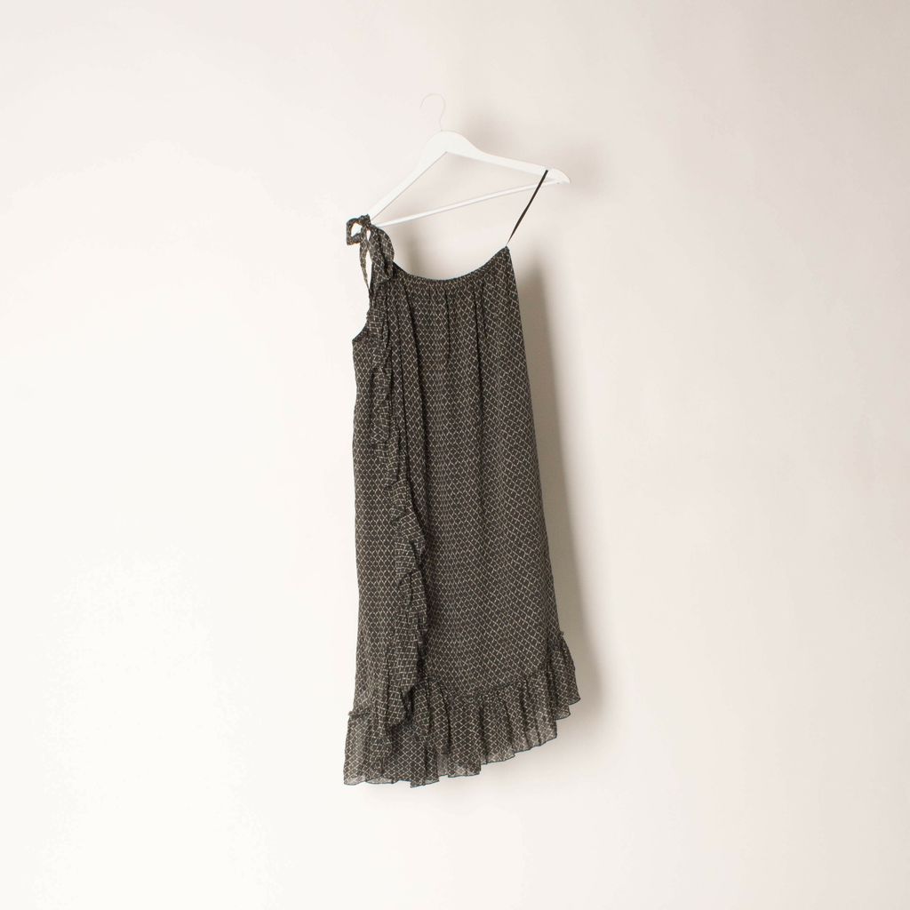 This dress is full of stylish surprises with its geometric static print and tie off shoulder strap. Features ruffle trim throughout and elastic band up top for security.