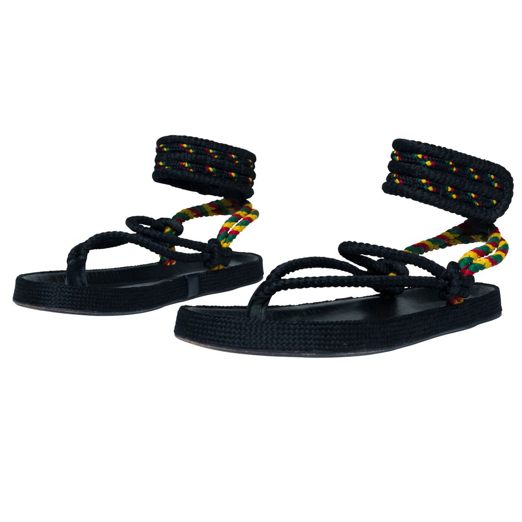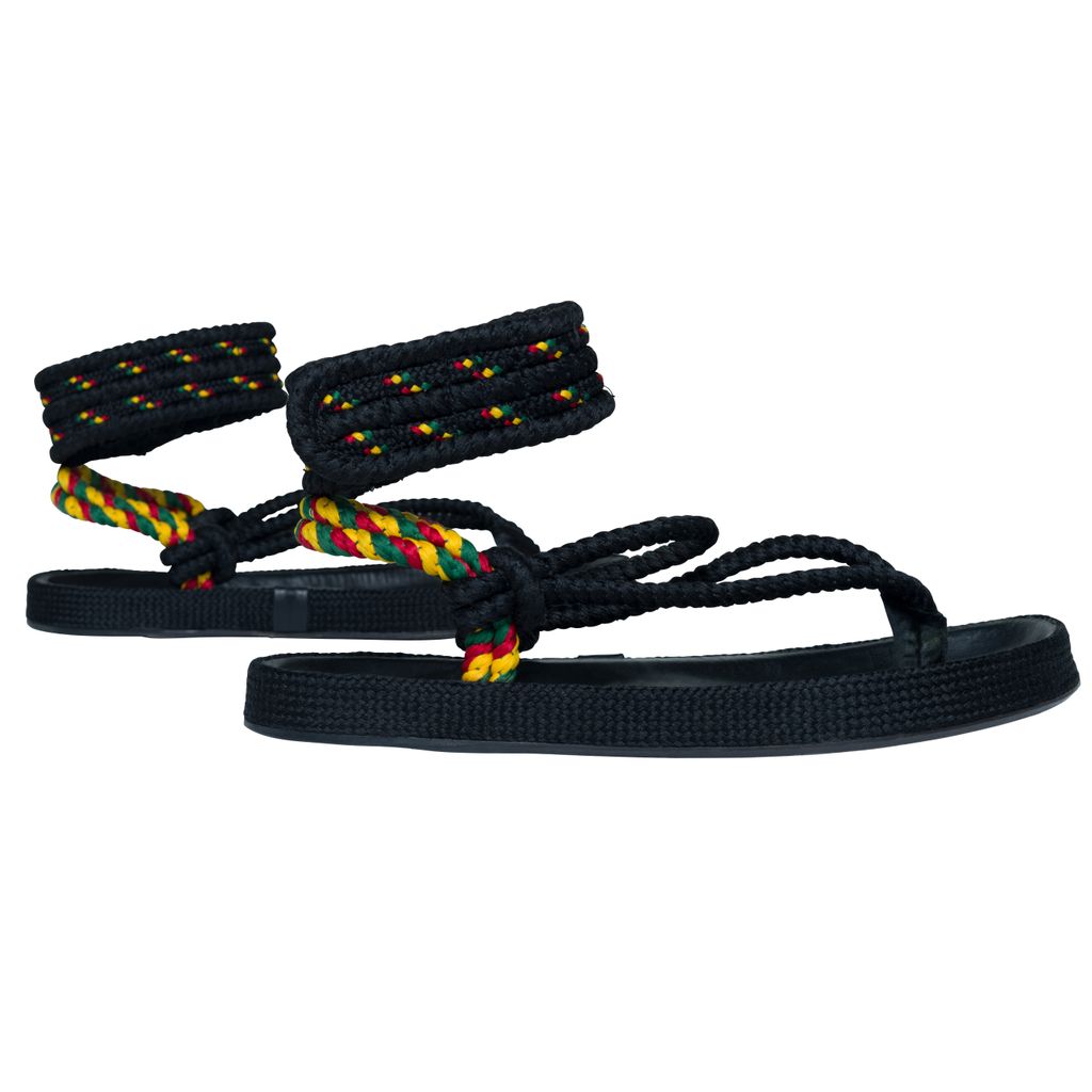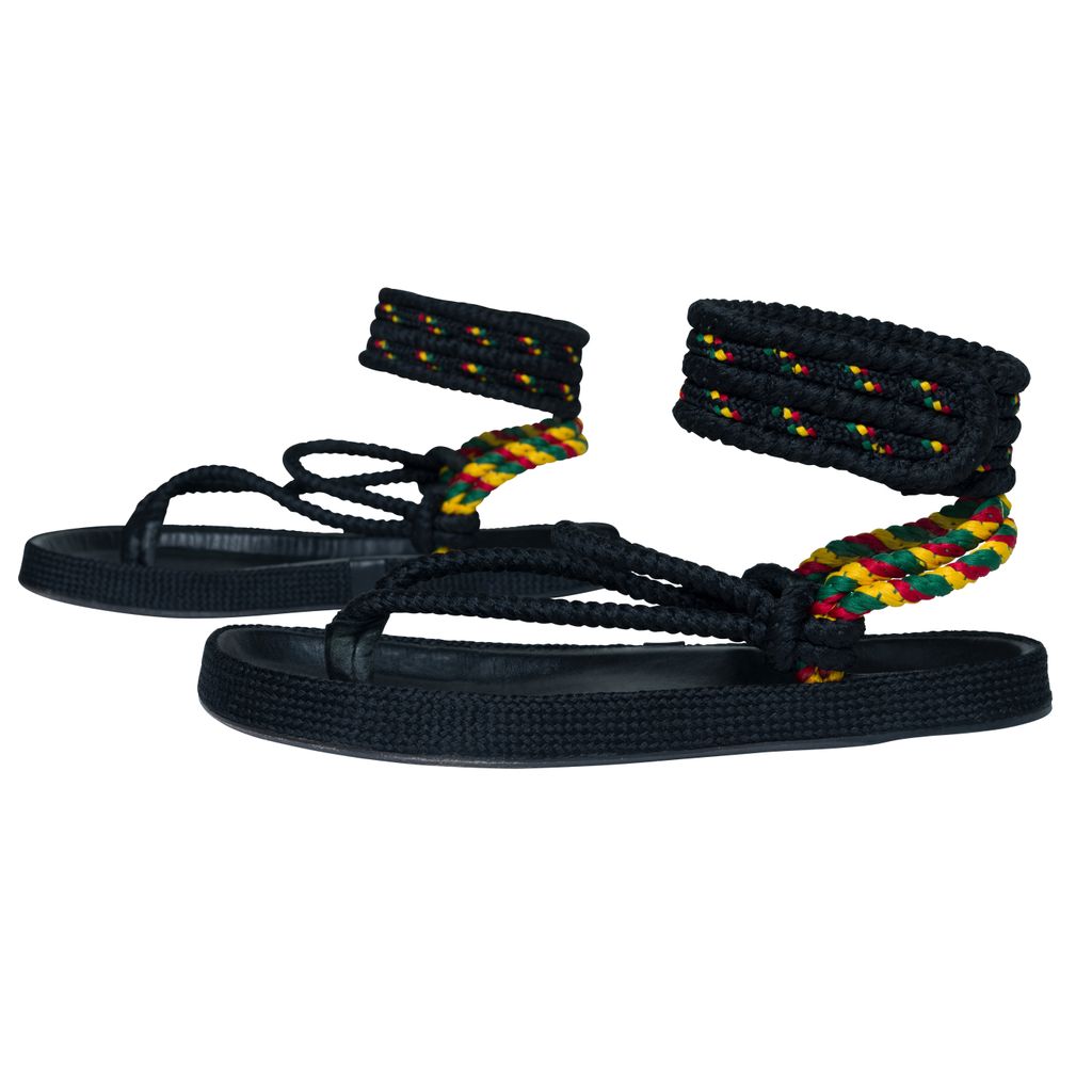 Isabel Marant Etoile Multicolor Rope Sandals feature thong strap, rope covered vamp, grip strap ankle wrap with velcro, and leather lining and sole.