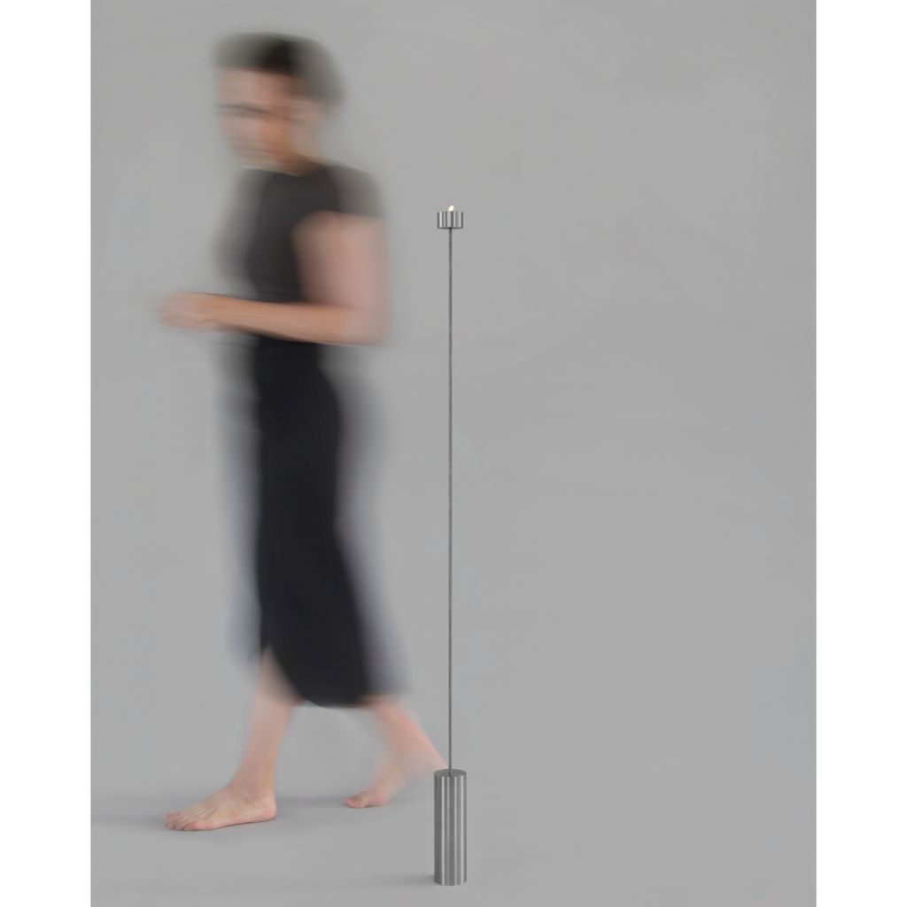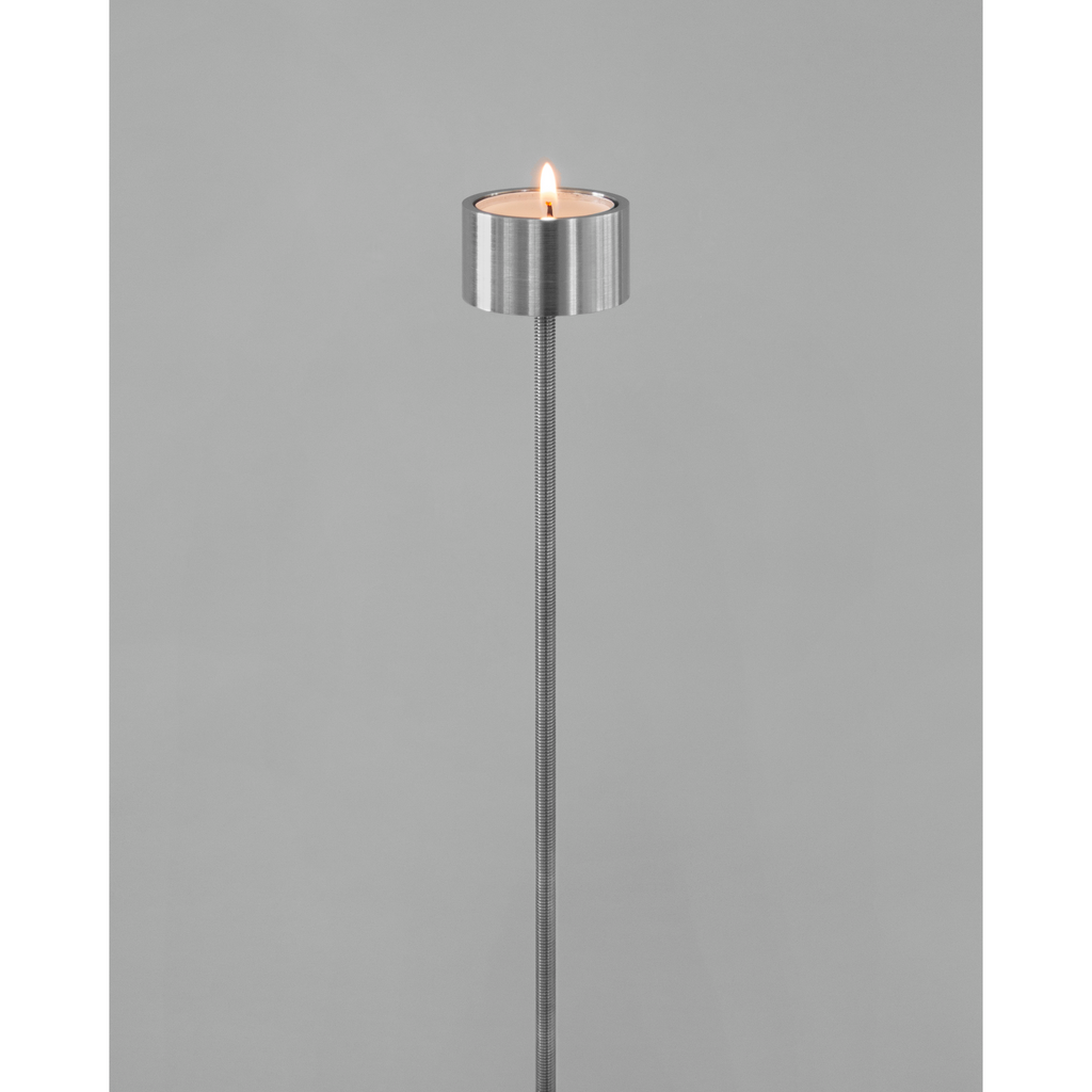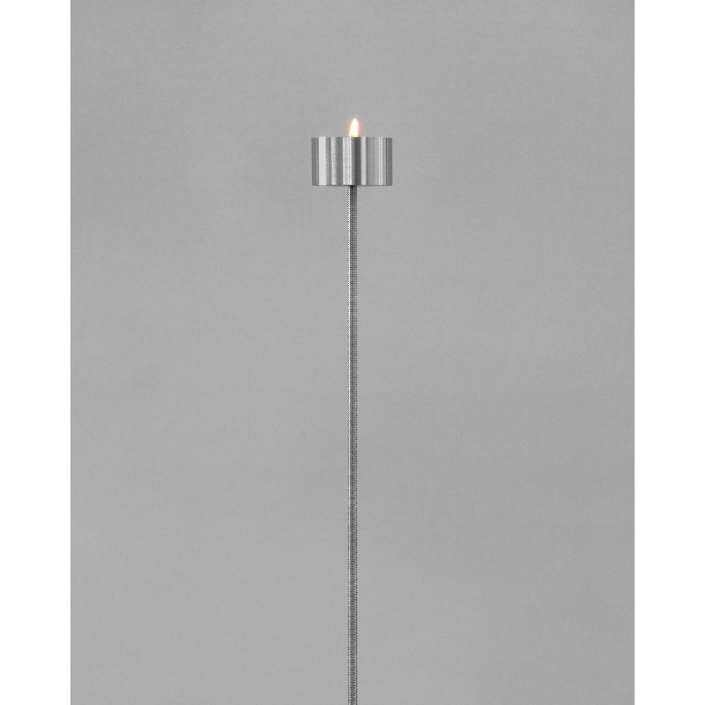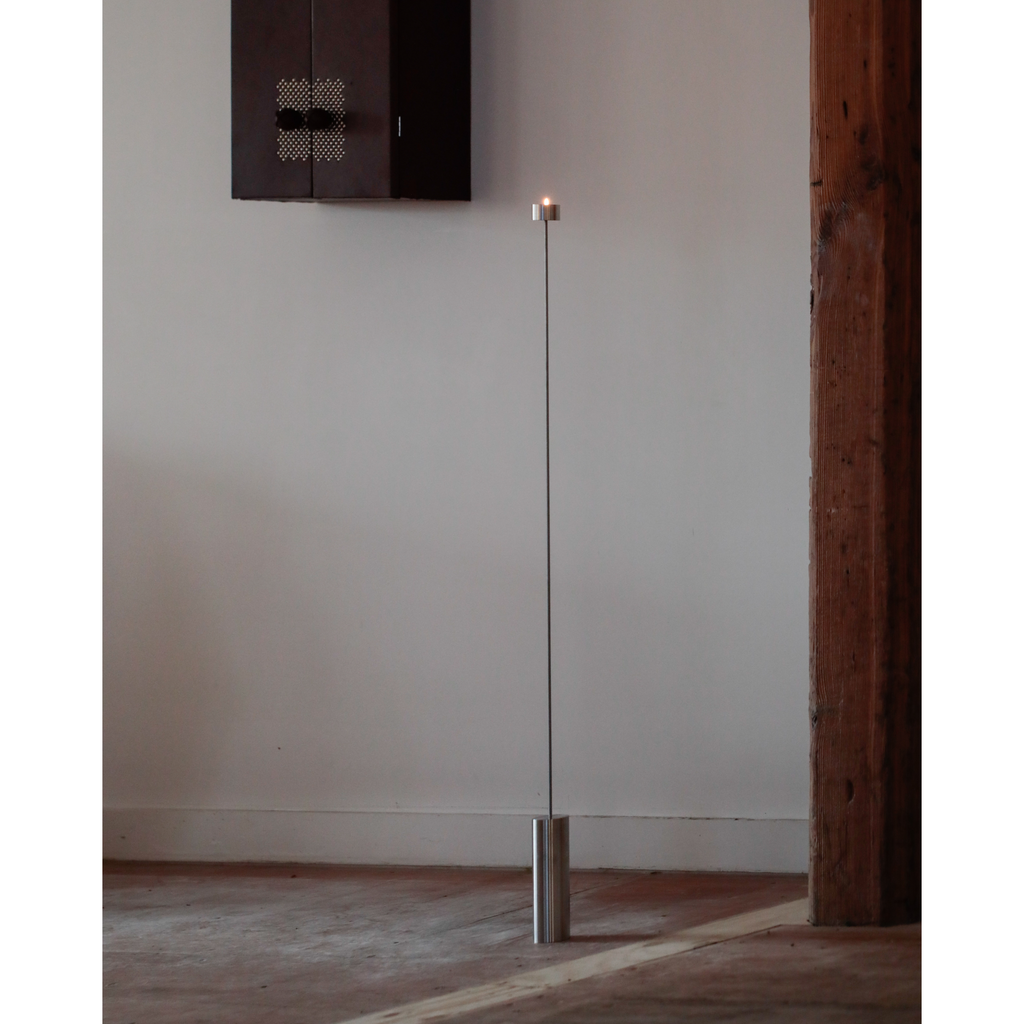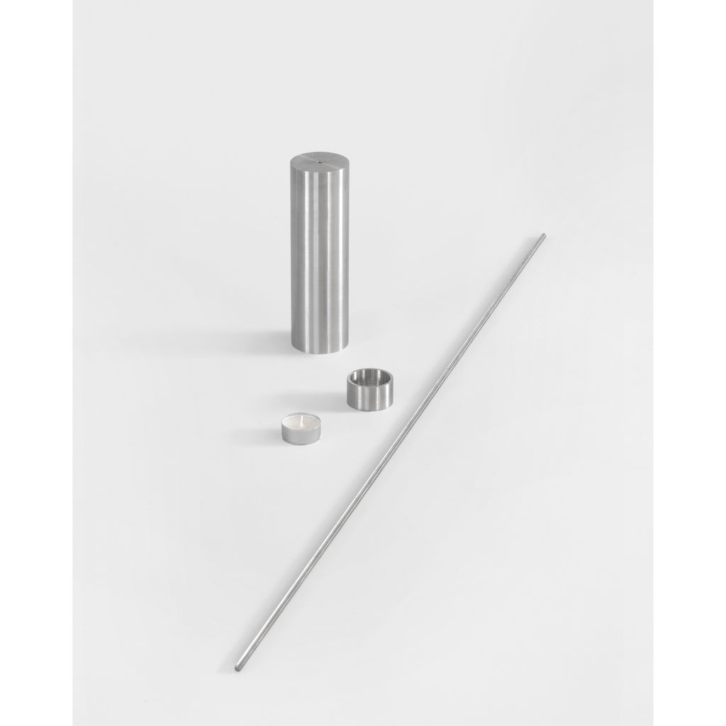 Candleholders may seem obsolete, displaced by more efficient lighting technologies. Yet they remain part of a household ritual. In seeking to elevate this domestic habit and highlight the flame as a symbol of our wonder at fire, this project took shape. Italic is a floor candleholder with a slim structure that, at its peak and almost hidden, holds a tealight. It is delivered disassembled in a dedicated, reusable packaging, and includes five standard tealightsaded rod that adds texture, and a hollow cylinder that cradles the candle. The three parts are made of untreated stainless steel, with the base and hollow cylinder lathe-turned locally. The object transcends function — illumination is not its purpose so much as inviting us to contemplate light. The flame remains clearly visible while the candle seems to disappear. Furthermore, the acts of lighting and blowing out set the rod into a subtle sway, adding another sensory layer. In its balance between weight and movement, between use and observation, the piece turns simple actions into a reflective ritual.