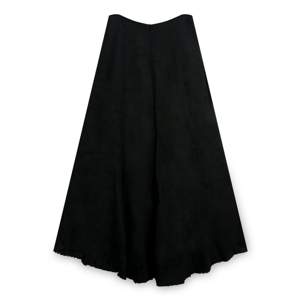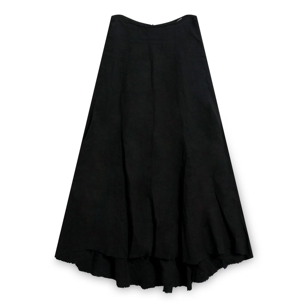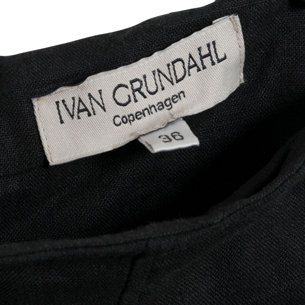 This linen midi skirt from Danish designer Ivan Grundahl features subtle pleated detailing, concealed back zip closure, and raw hem. In excellent condition.