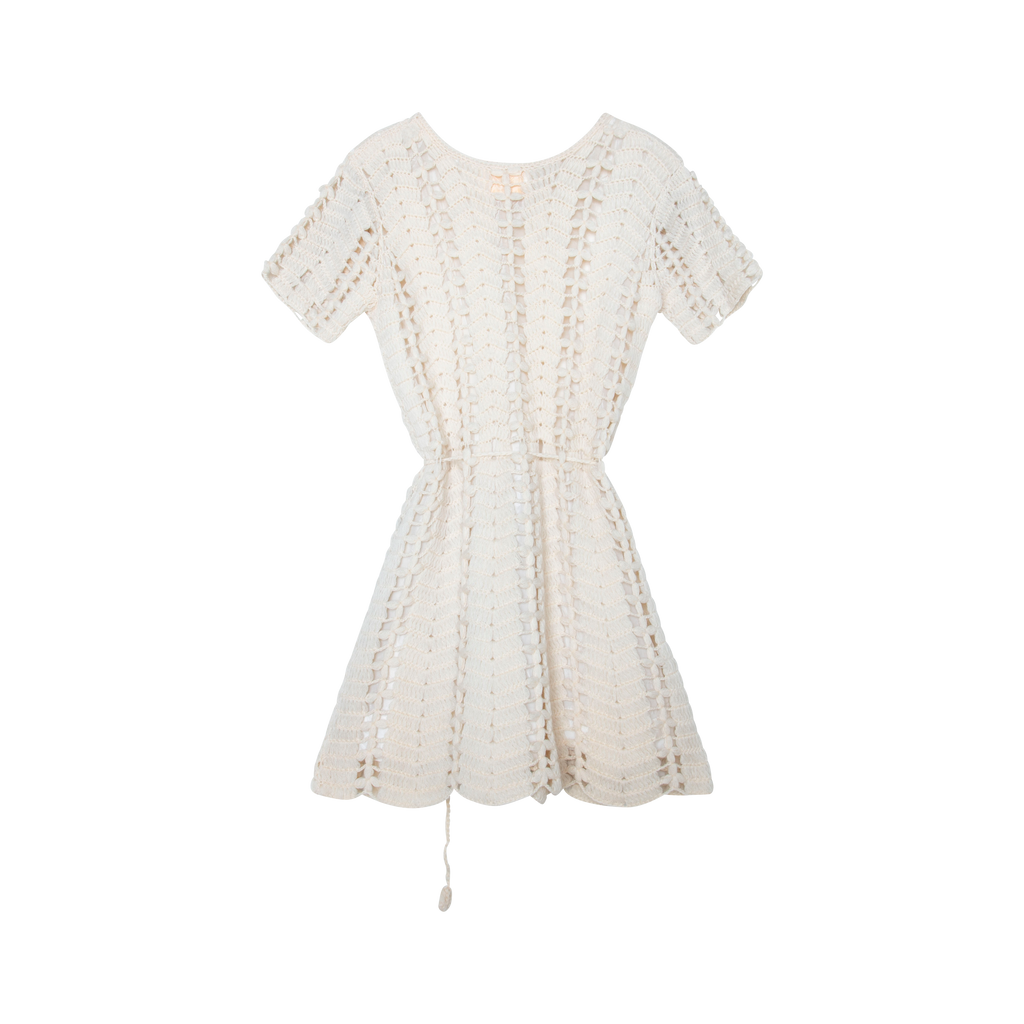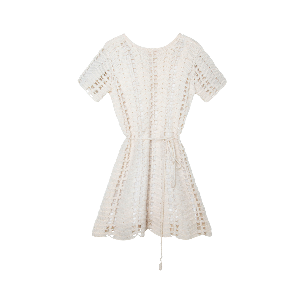 Ivory Wool Belted Mini Dress features detachable knit string belt, short sleeves, and knit design.