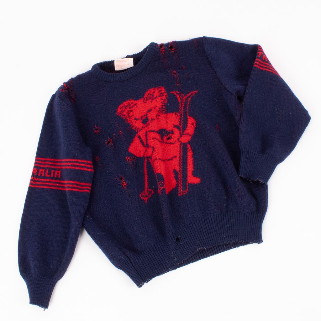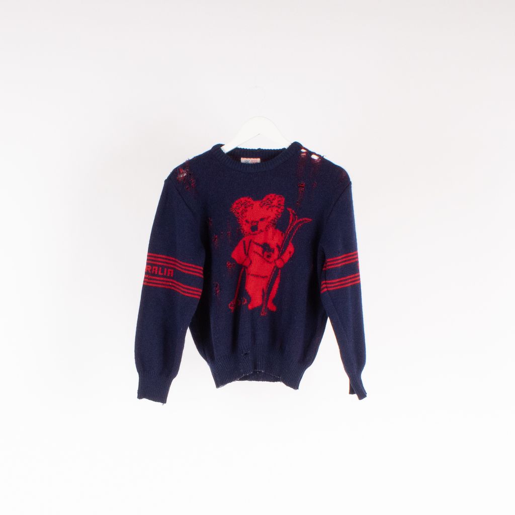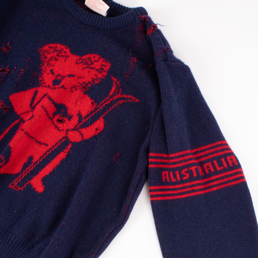 Reminiscent of the Ralph Lauren polo bear, this vintage sweater from Australian brand Jac-Tion has a ski koala. Features all over distressing, Australia text and bands on arms, koala with skis graphic on front, and rib knit bands at neck, waist, and wrists.