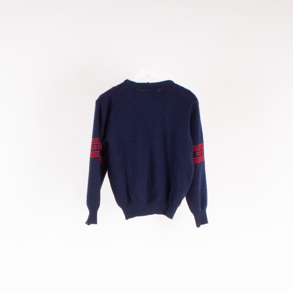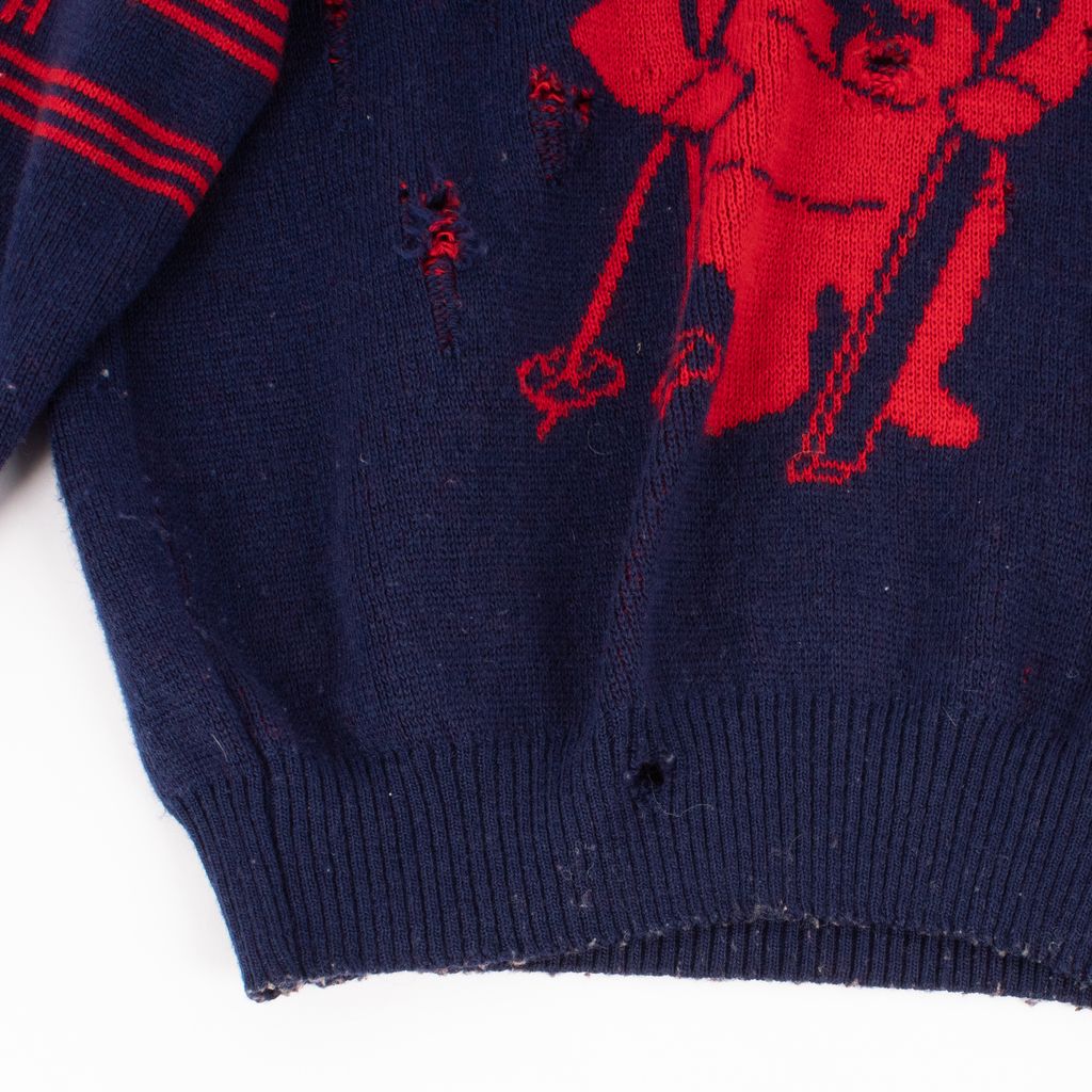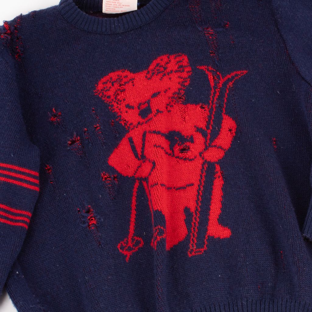 Reminiscent of the Ralph Lauren polo bear, this vintage sweater from Australian brand Jac-Tion has a ski koala. Features all over distressing, Australia text and bands on arms, koala with skis graphic on front, and rib knit bands at neck, waist, and wrists.