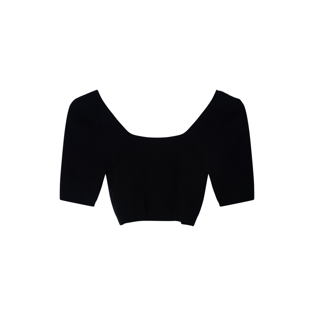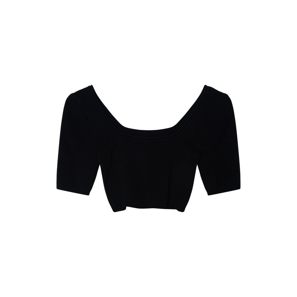 Jacquemus Black Le Haut Arancia Knit Crop Top features square neck, all over ribbed texture, fine knit, and fitted design.