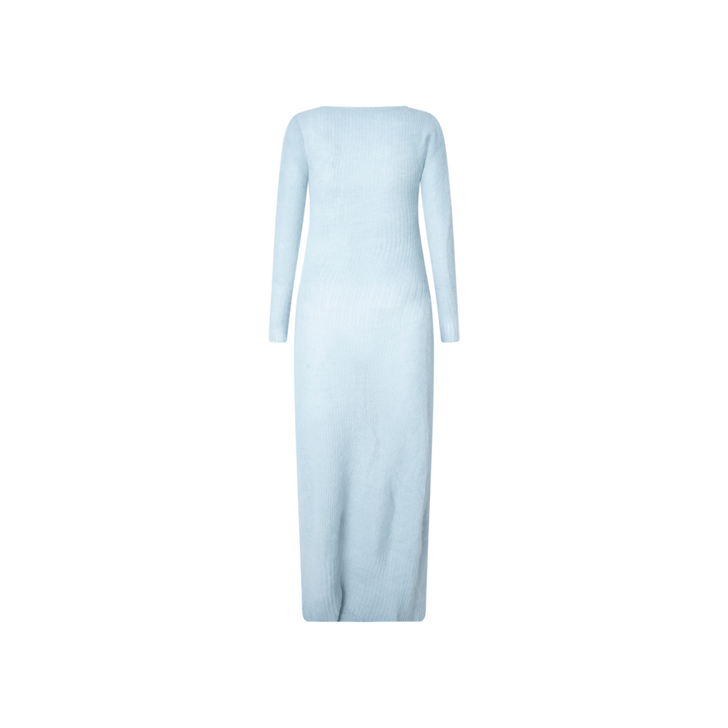 Jacquemus Blue La Robe Dao Dress features mohair and alpaca wool, ribbed knit, scoop neck, long sleeves, side slit, straight hem, and slim fit.