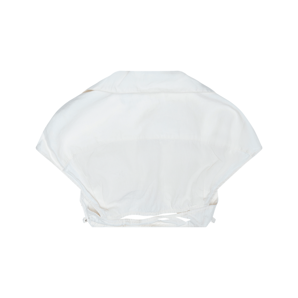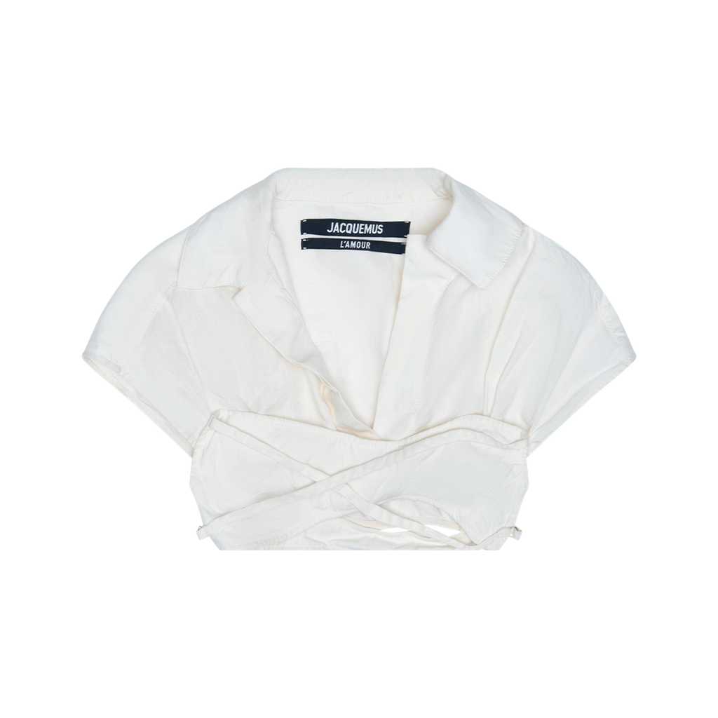 Jacquemus Crop Top features side clasp closure, V-neck collar, and criss cross detail on the front.
