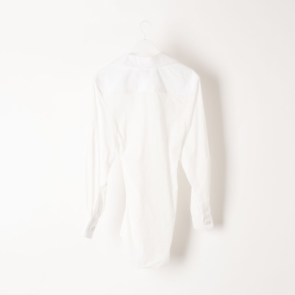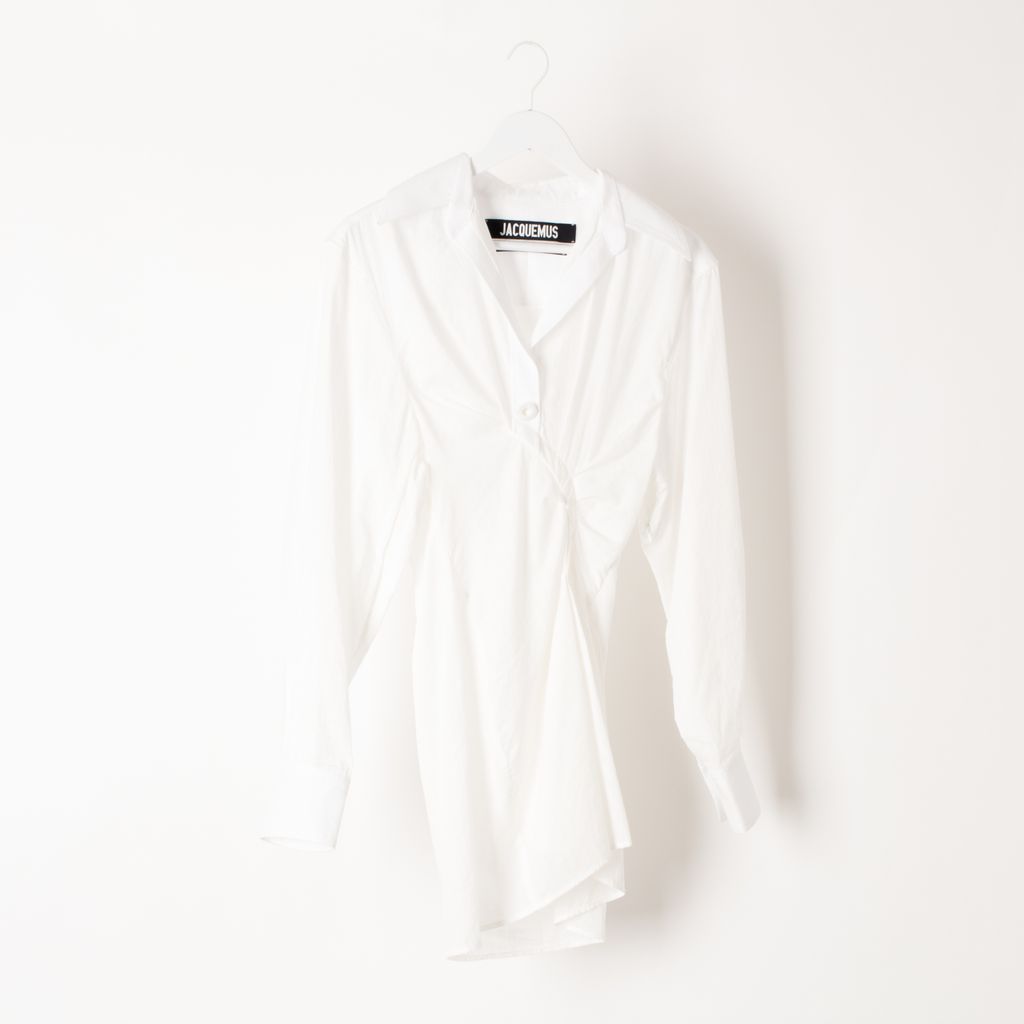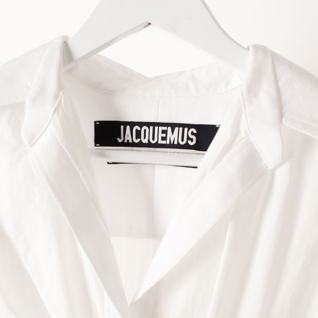 Worn once, La Tunique Maceio dress from Jacquemus, 100% cotton. Dress embodies the label's quintessentially French style. Crafted from ultra-lightweight white cotton, the shirt-like design features an asymmetric gathered effect through the waist and is finished with hand-stitched fabric buttons for an artisan touch. We love how the flirty silhouette looks teamed with a pair of barely-there stiletto sandals. One of two buttons needs to be re-applied to garment, included in purchase.