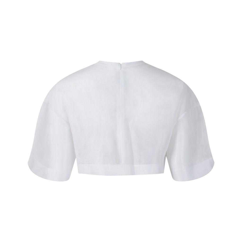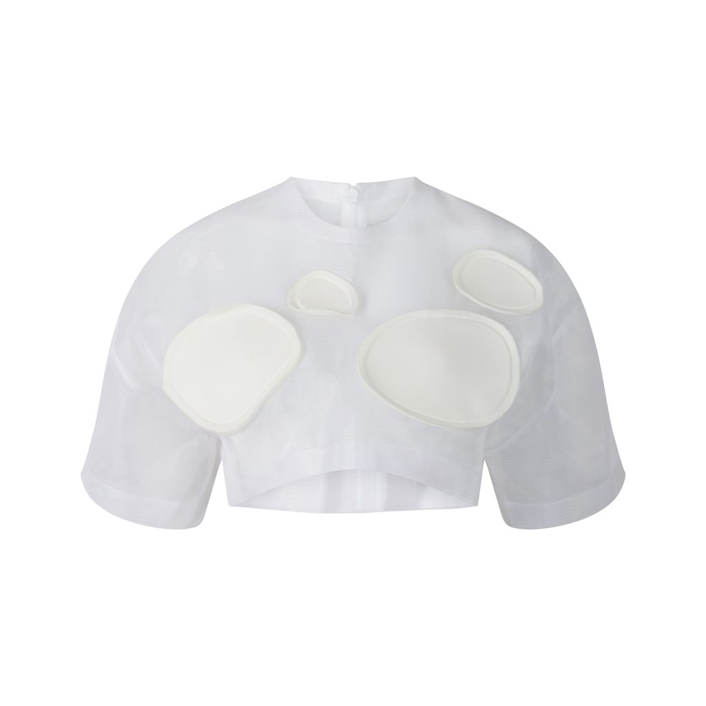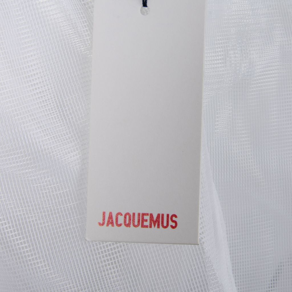 This white mesh cropped top from French label, Jacquemus, features a banded round collar, organic shaped patches, hidden back zip for easy wear and has an oversized boxy silhouette. Brand new with tags.
