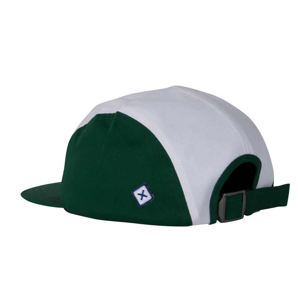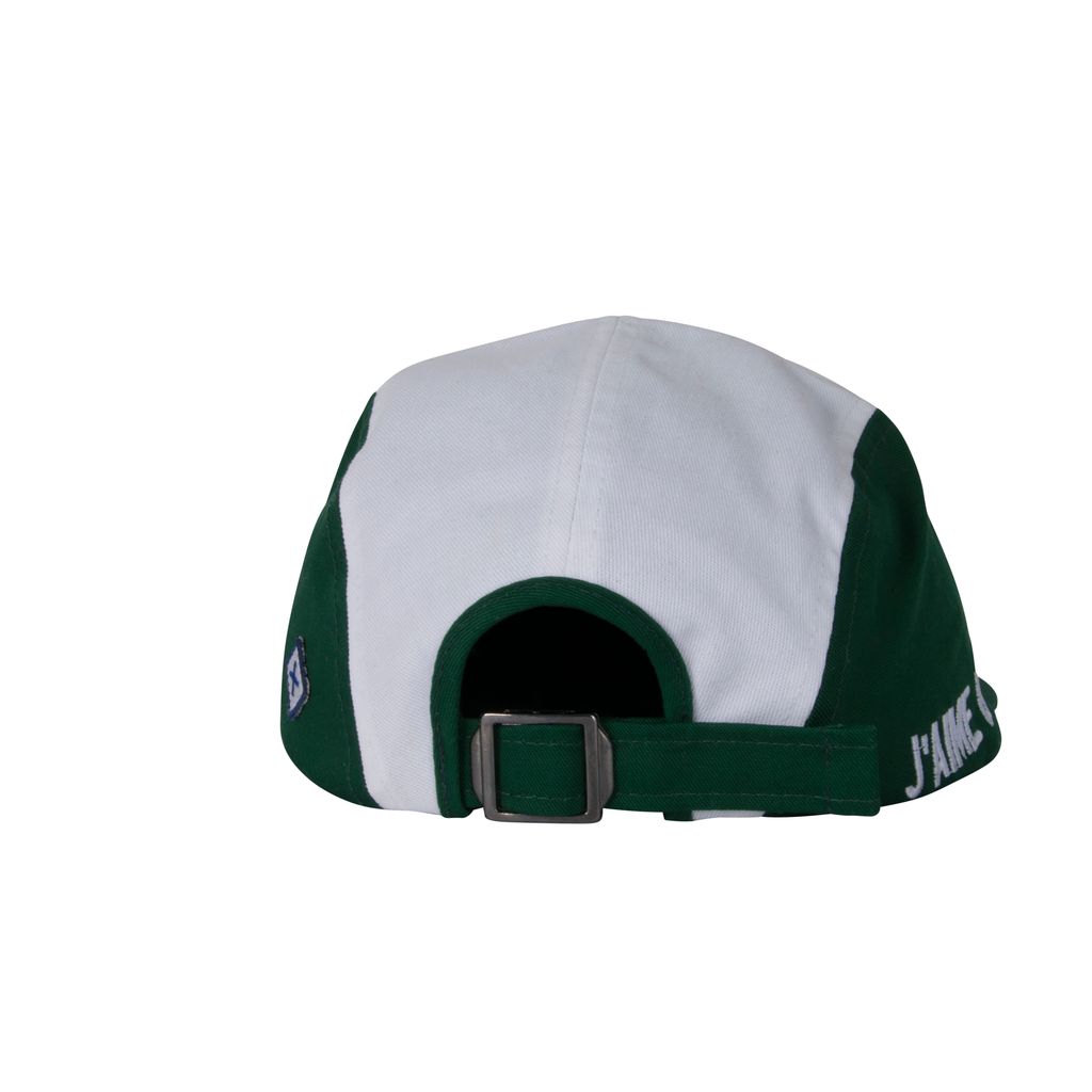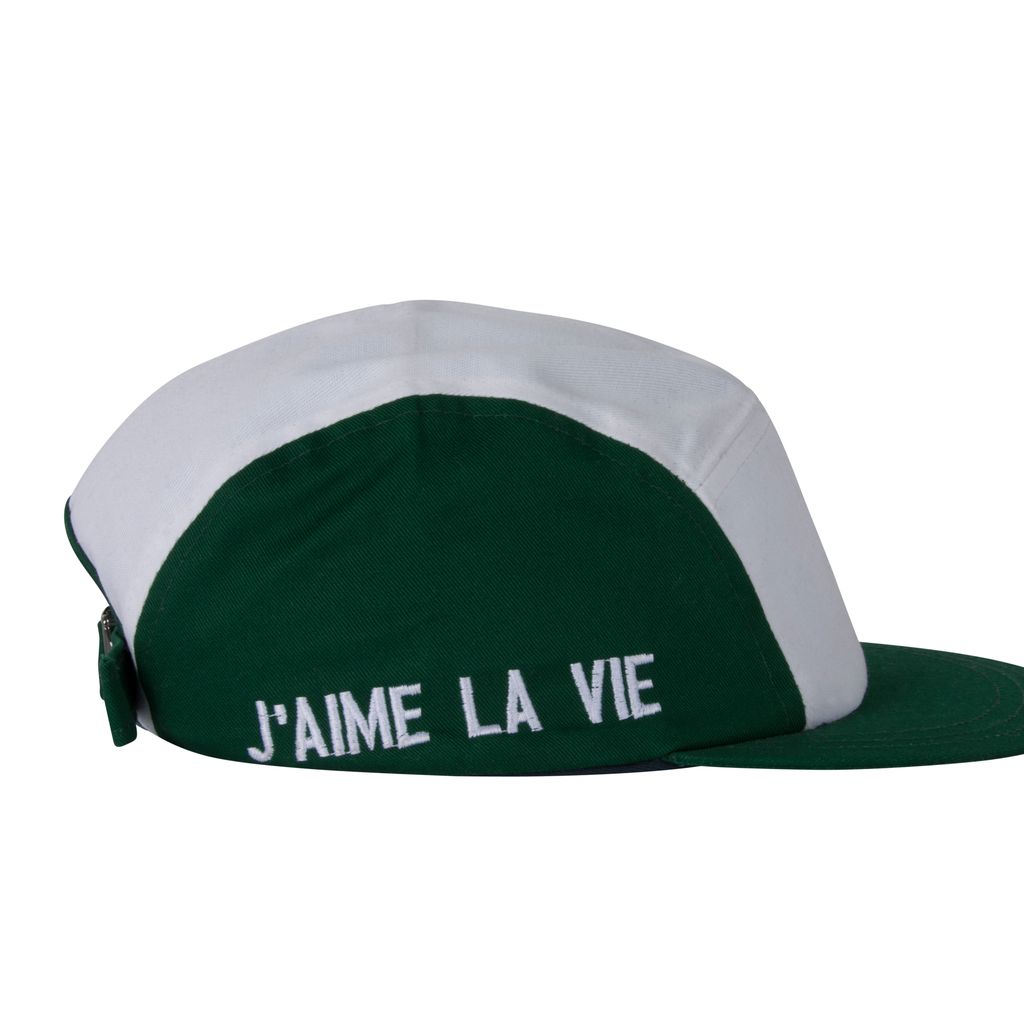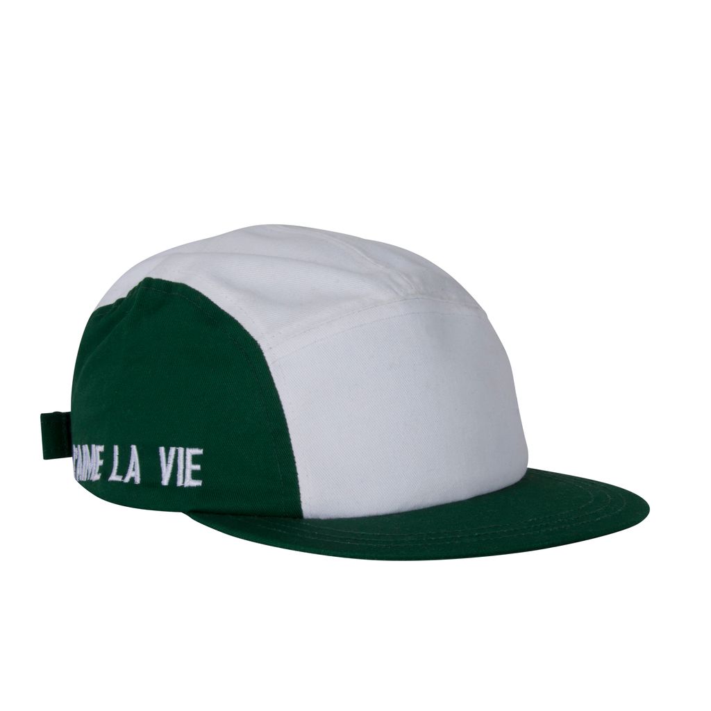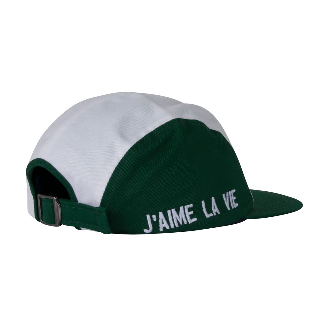This Jacquemus x Larose Paris panel hat features green panel detailing and has "J'AIME LA VIE" embroidered on the side with an adjustable buckle at the back. In good condition, no signs of wear.
