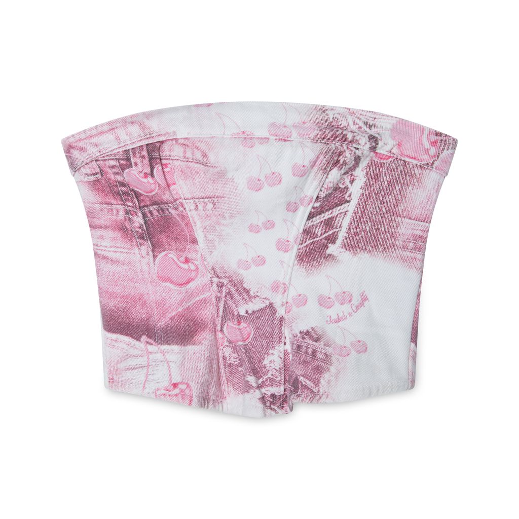 Jaded London Cherry Babygirl Denim Corset features zip up back, bandeau top, and pink vintage cherry print.